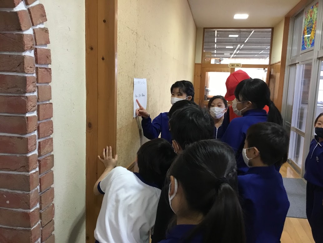 清掃の縦割り班で協力し、校舎内に隠された問題を探して解きました。