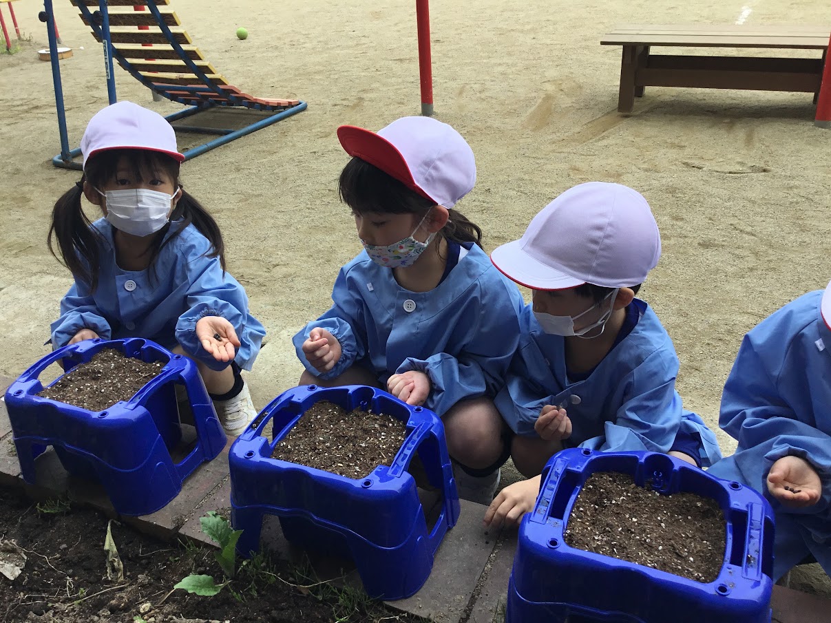子どもたちはやさしく種をまいて、土をかぶせていました。