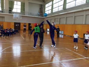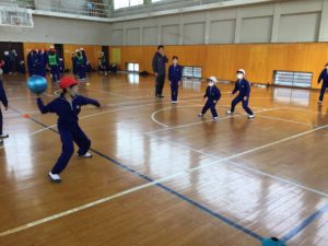 種目はやわらかいボールを使ったドッジボールです。清掃の縦割り班でブロックごとにリーグ戦をし、