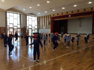 2年生が跳び方やどうすれば長く跳び続けられるかなど、