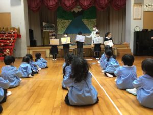 紙芝居の読み聞かせを行いました。お話は、「たぬきの糸車」です。