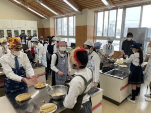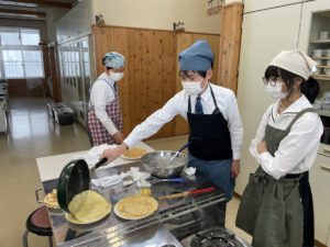 6年生は慣れた手つきで生地を混ぜたり、フライパンで焼いたりしていました。