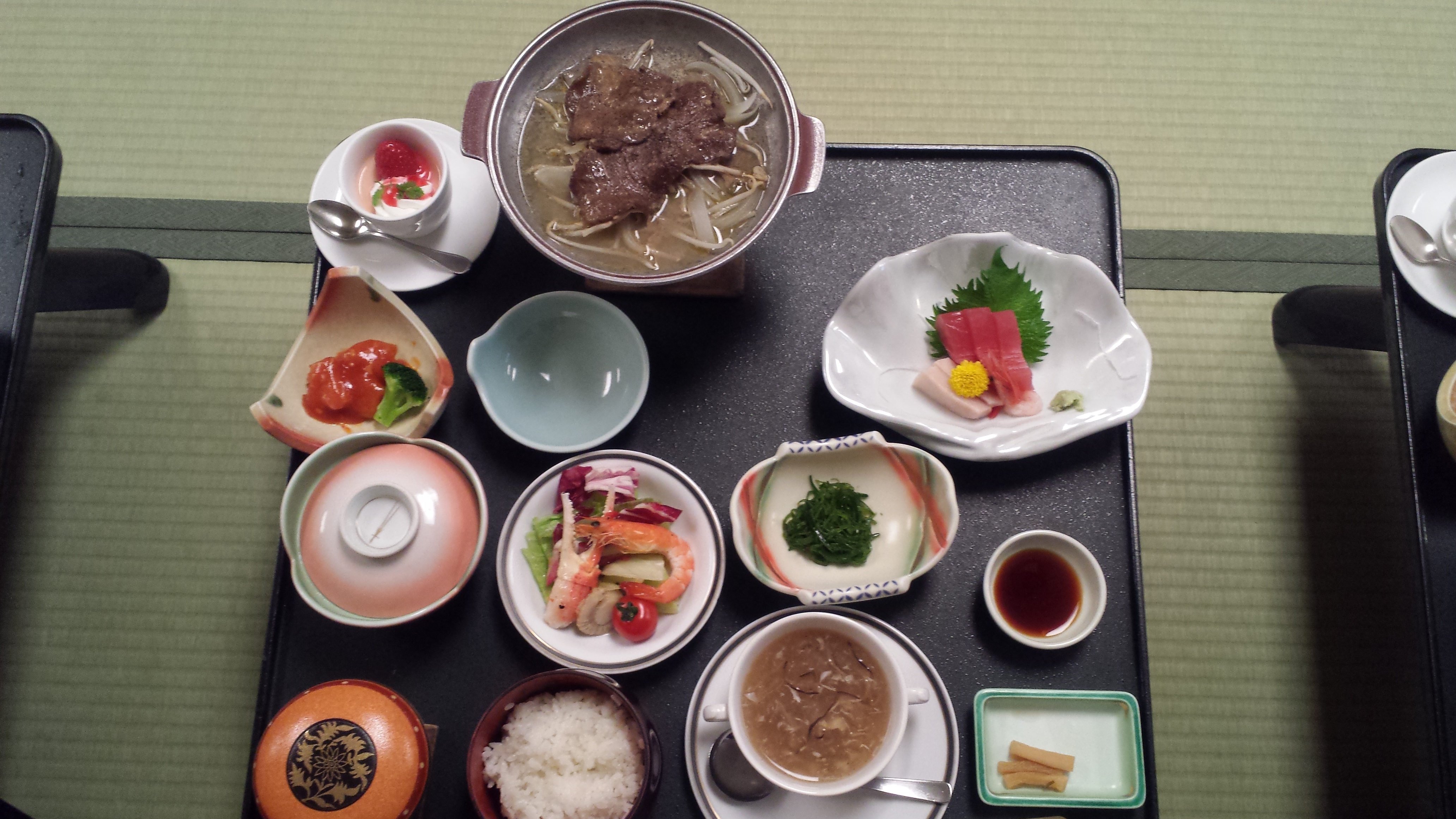 最後の夕食は、気仙沼の新鮮な魚介類を豊富に使ったお料理です。海老やマグロ、ぶりの刺身にフカヒレスープ、蒸した海老と蟹、牛タンの焼き肉までついています!みんなにこにこ笑顔で幸せそうです!