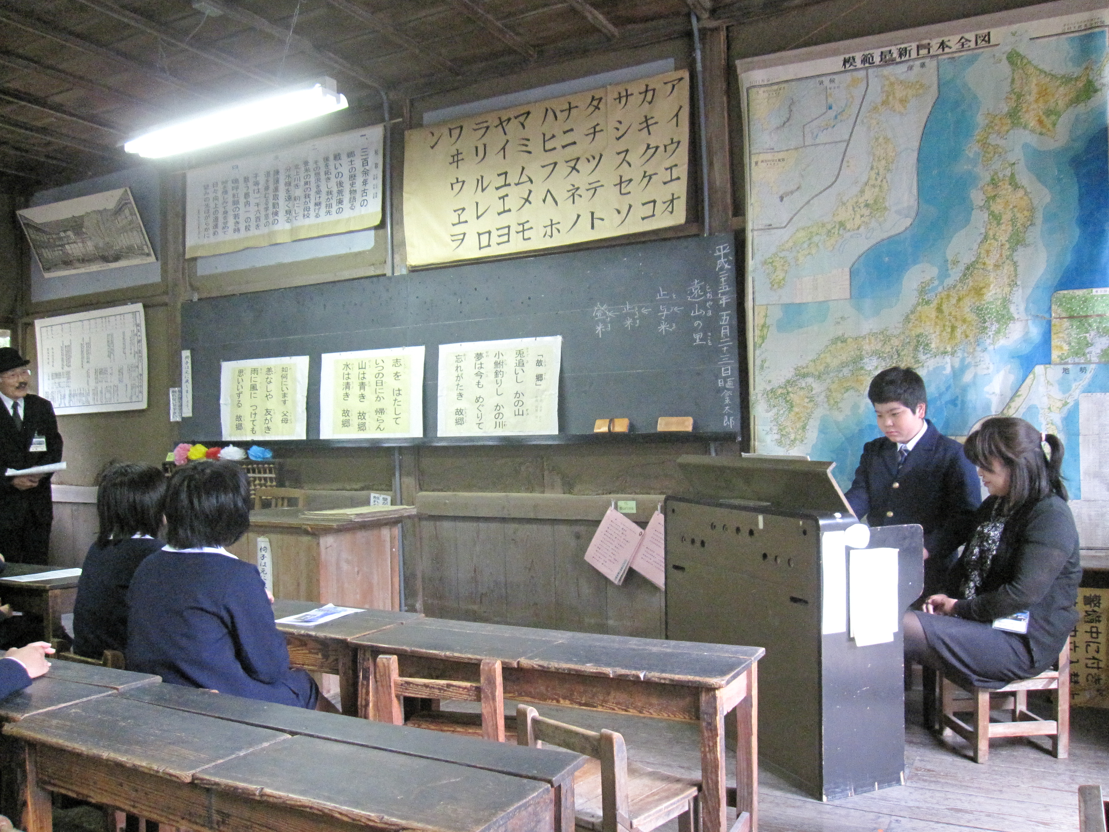 登米の教育資料館では、昔の机といすのある教室で、お話をきいたり、オルガンの音に合わせて「ふるさと」を歌ったりしました。