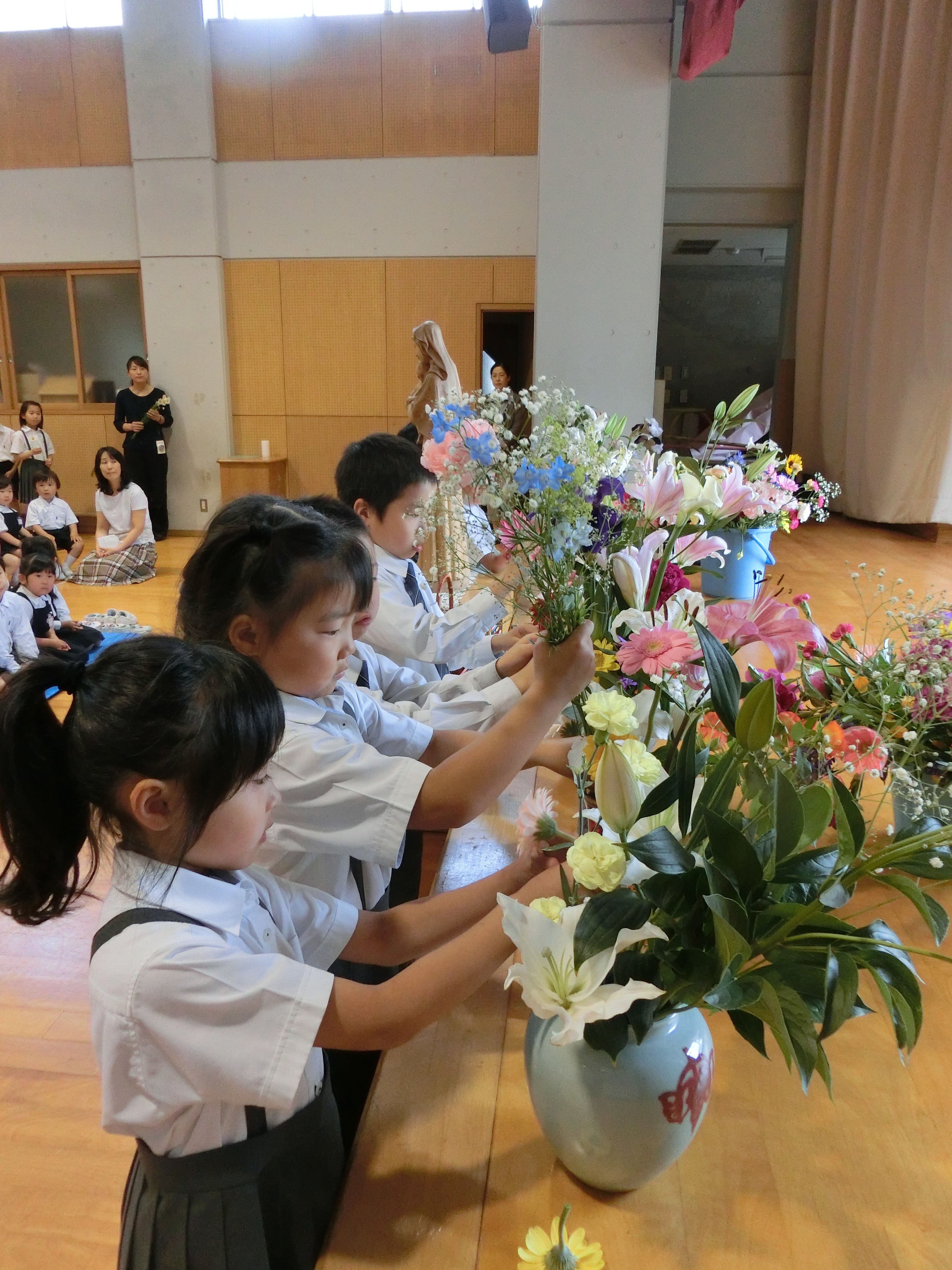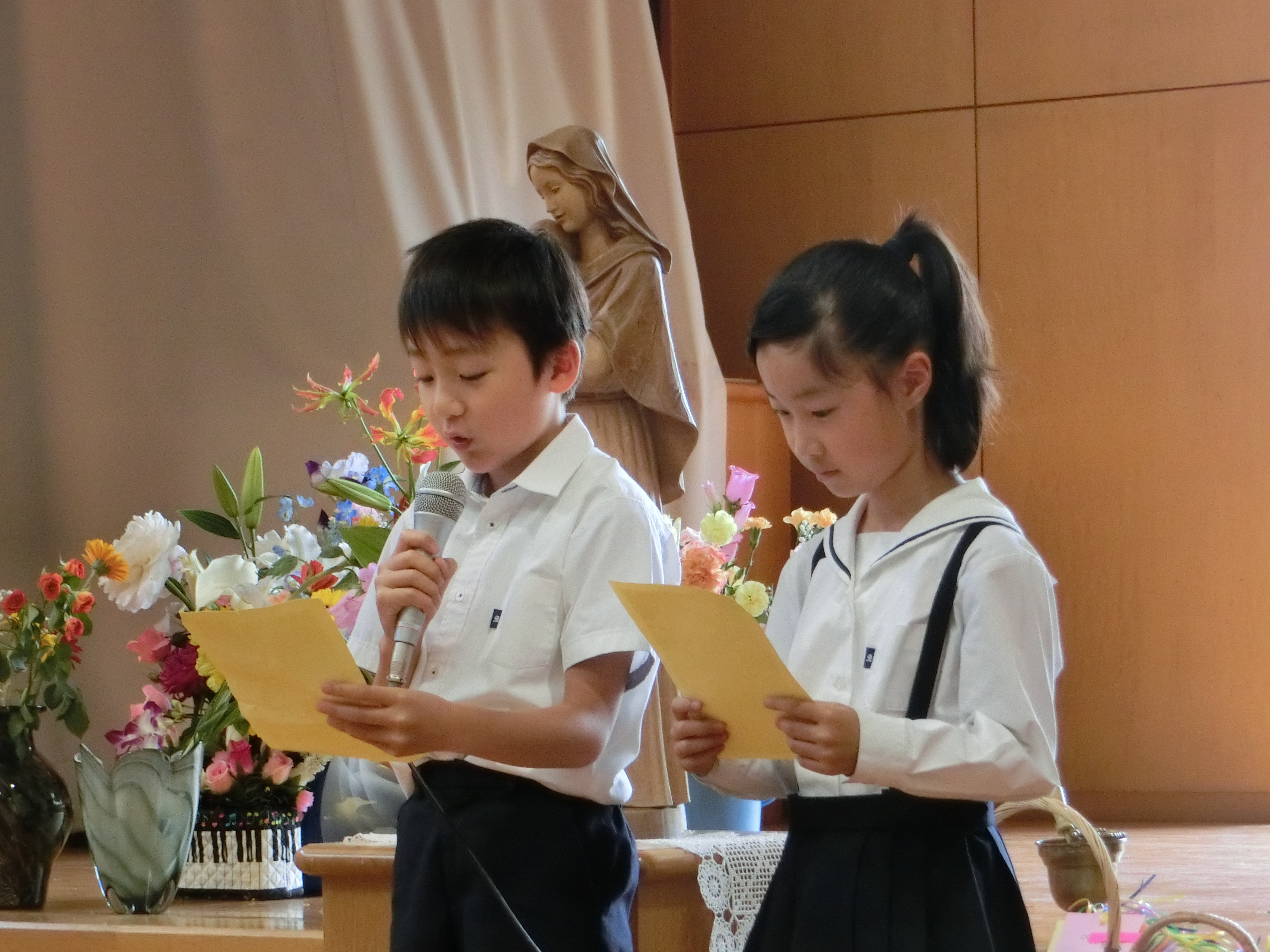 5月は聖母月であり、マリア様を思い祈る月です。子どもたちは5月に入ると毎日、マリア様に喜んでもらえるように、自分で決めためあてを守るように心がけてきました。今日は、その振り返りのカードとお花をささげました。