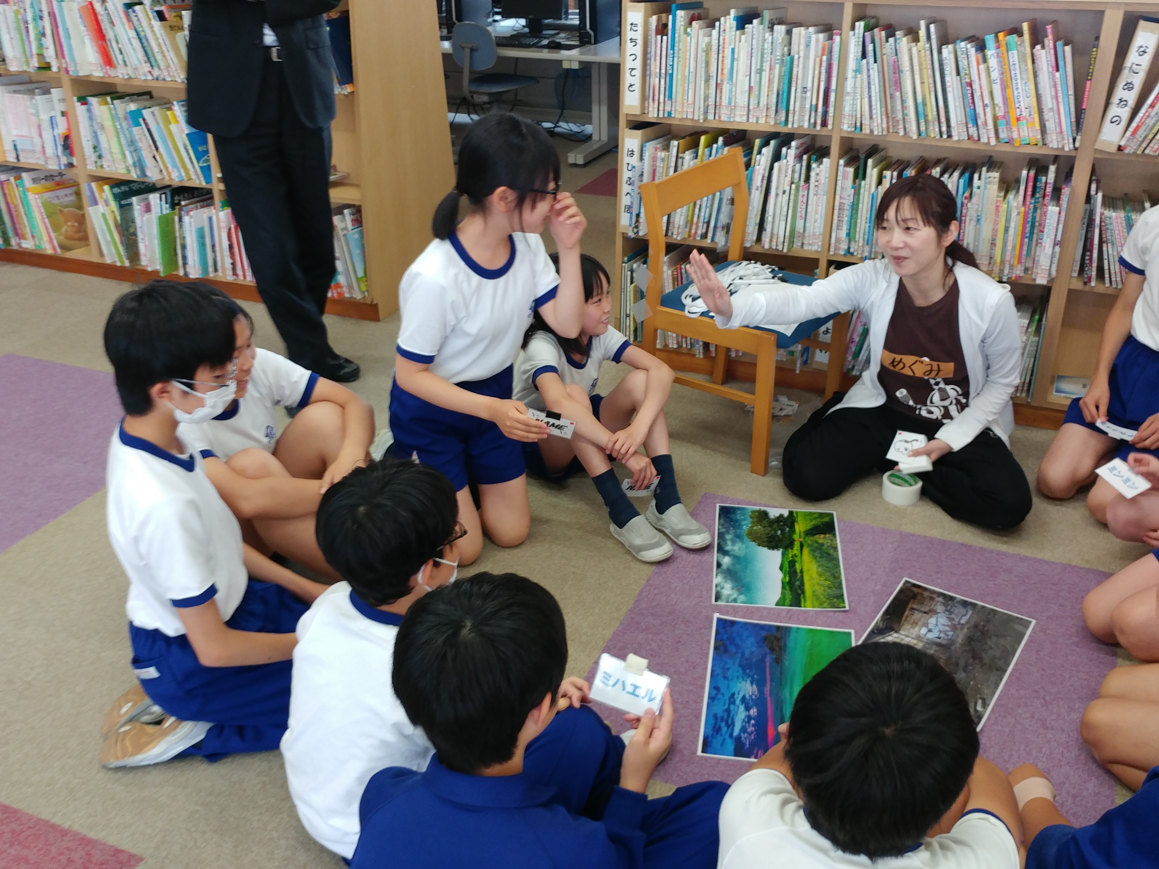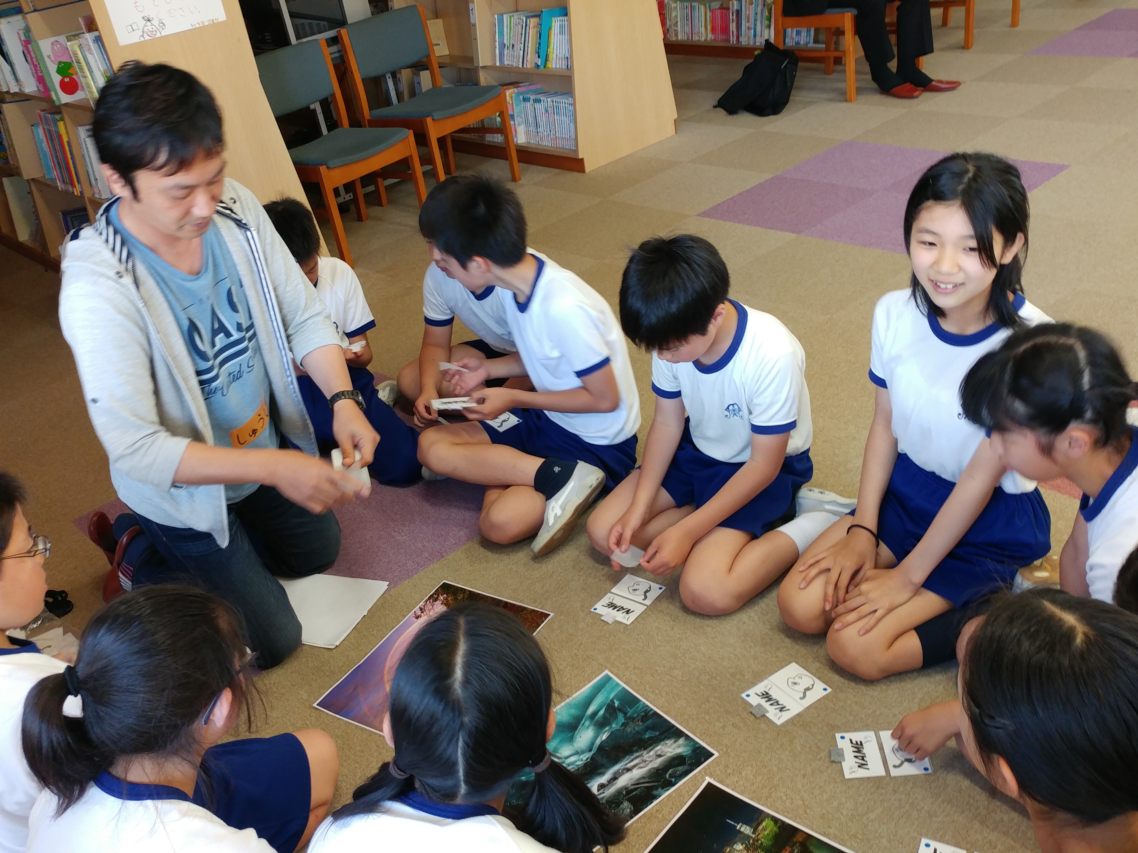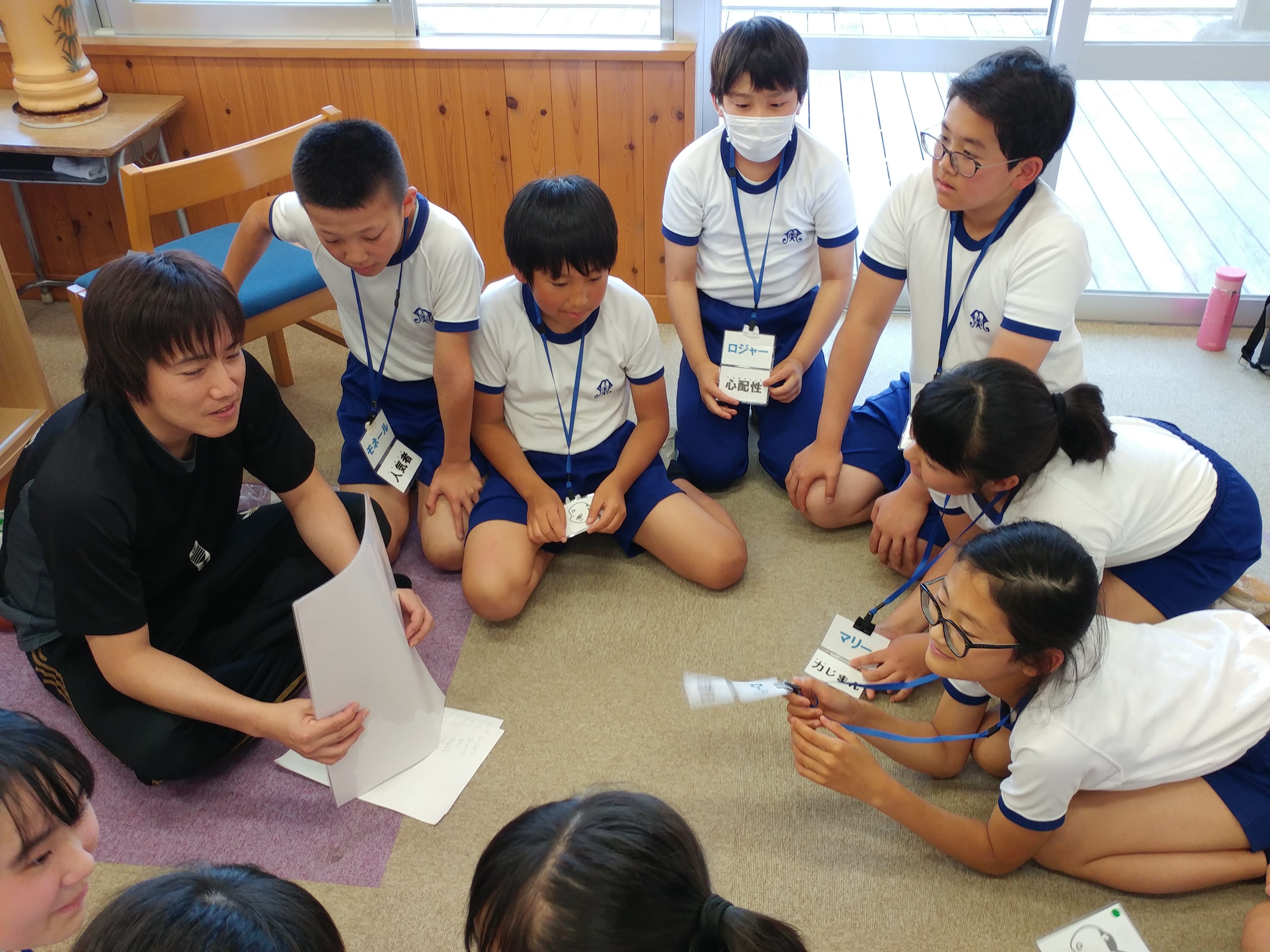 福田修志さんは劇作家・演出家でもあります。本物の役者さんの演技に見入ったり、コミュニケーションゲームをしたりしました。後半は、グループ毎に物語を創作しました。アドバイスをいただきながら、話し合い、世界で一つだけの物語が完成しました。
