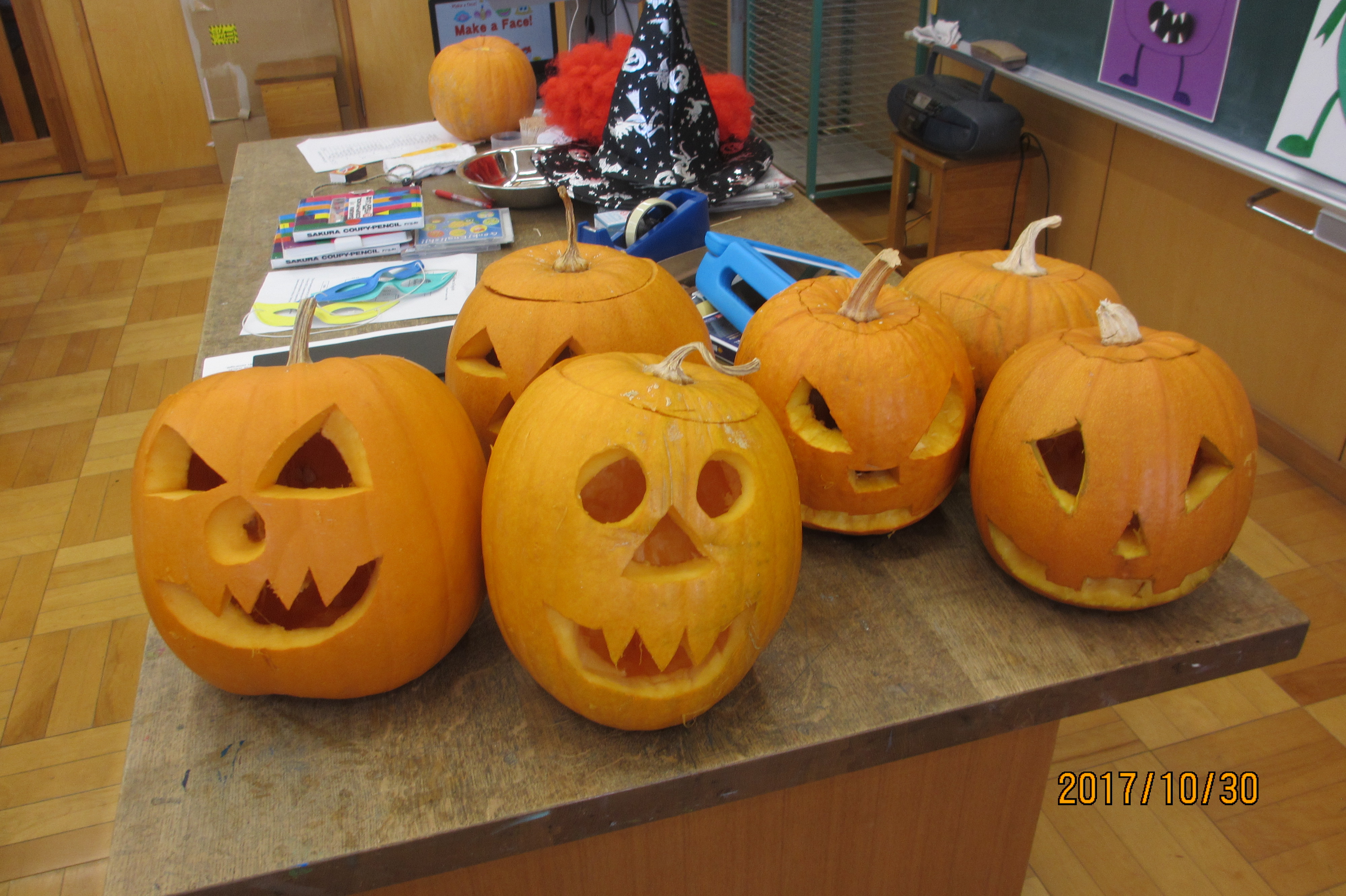 10月30日(月)にこども園の子どもたちが小学校に来て、「かぼちゃランタン」づくりをしました。