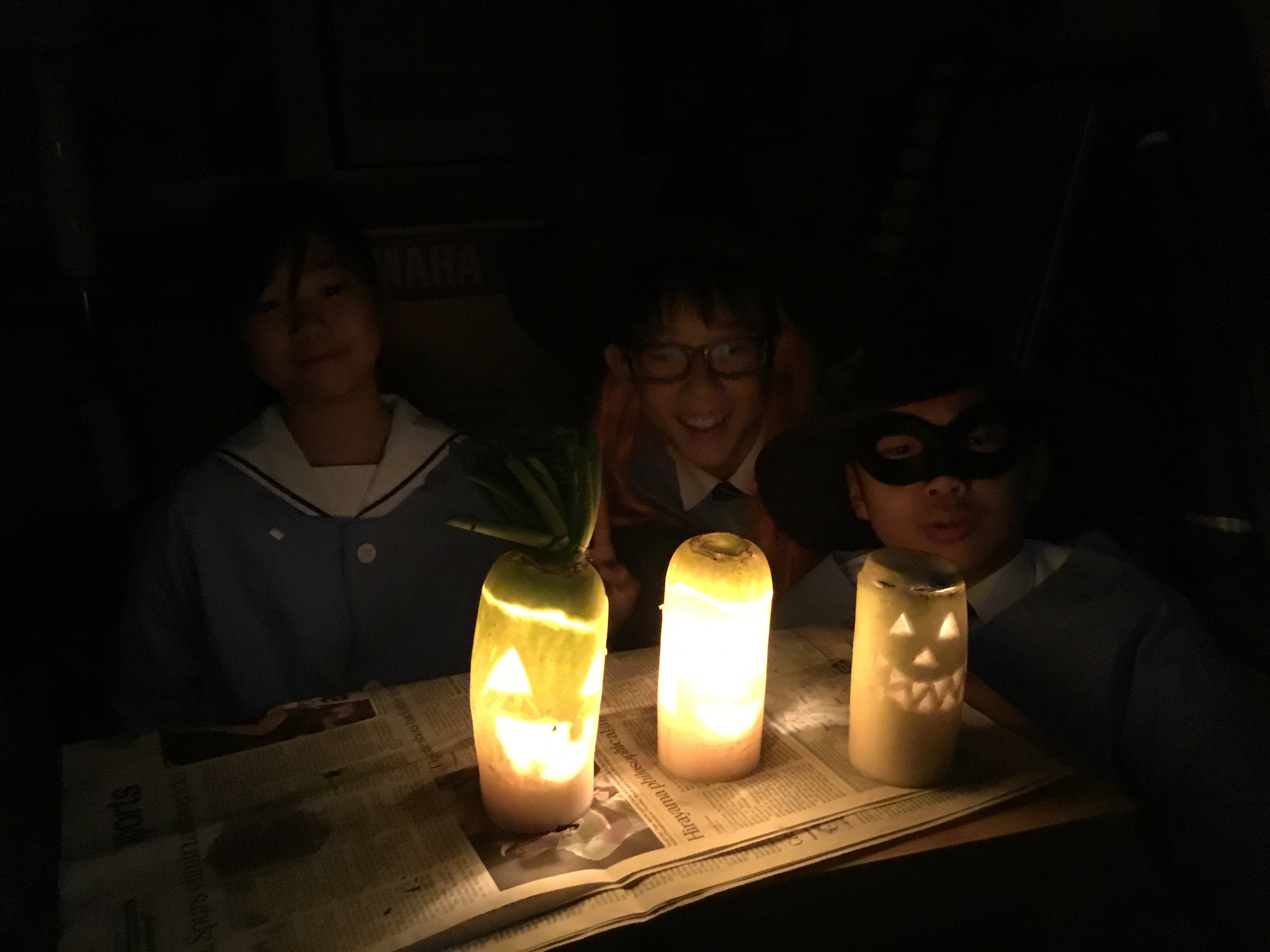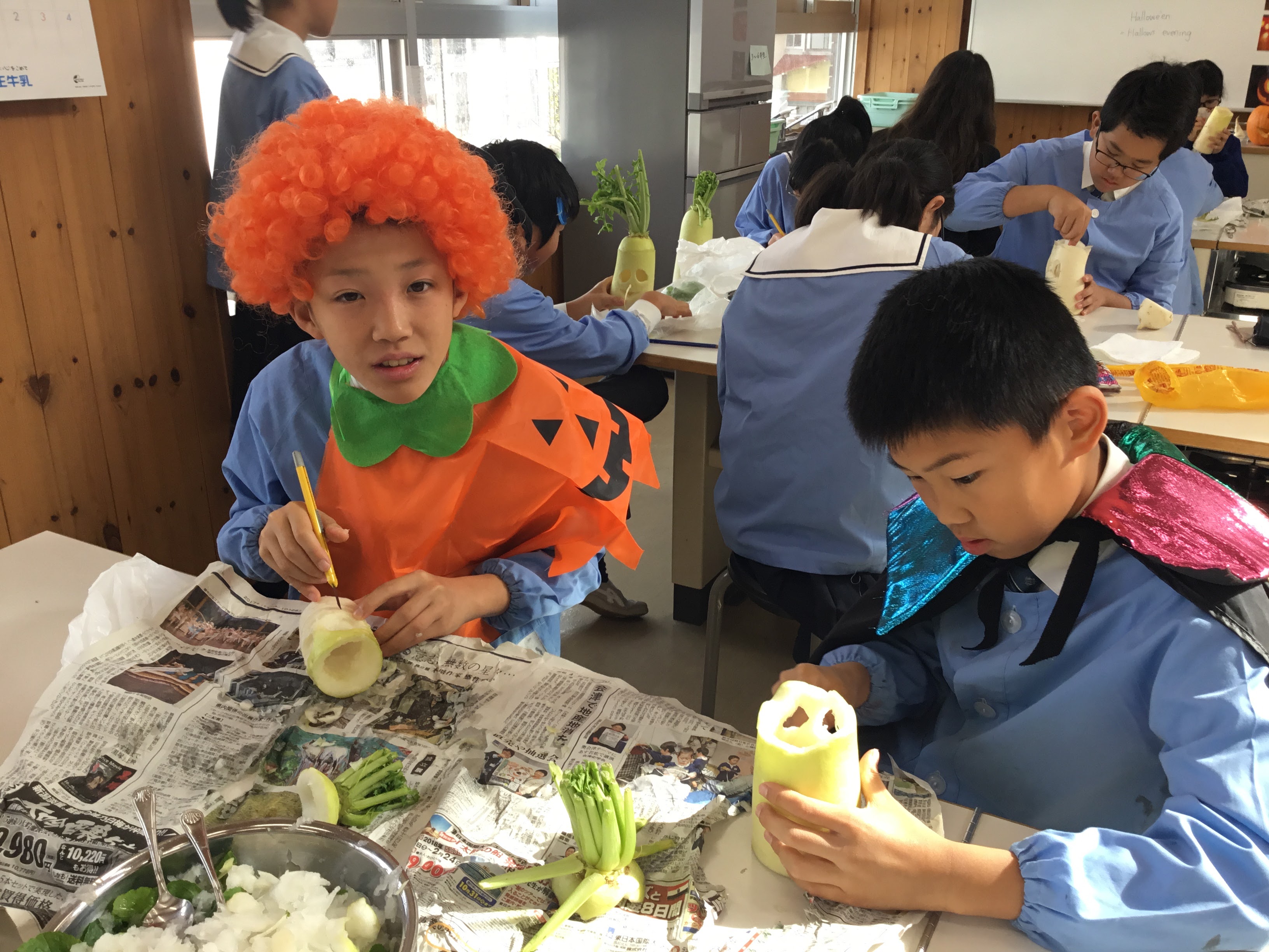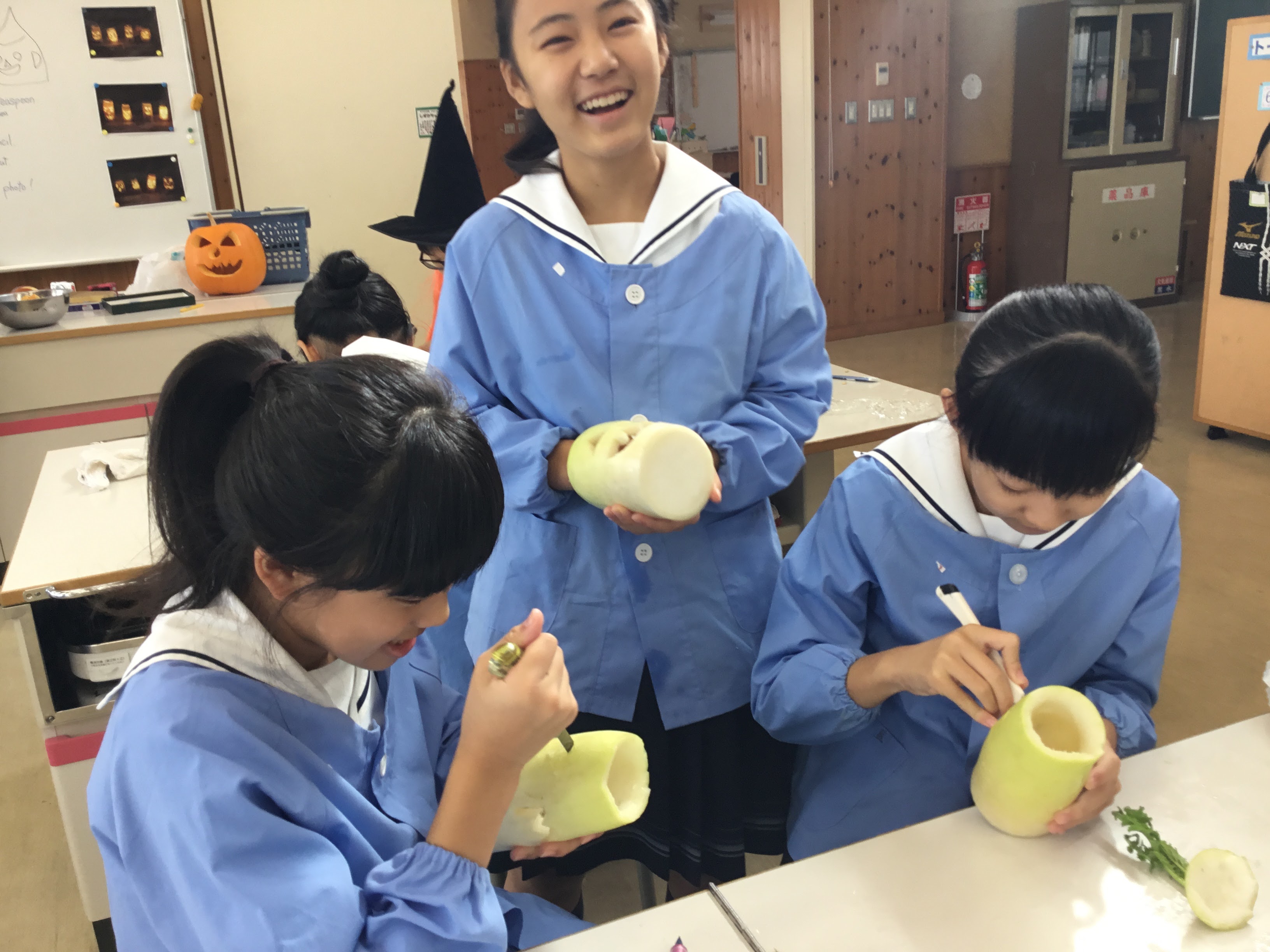 6年生が英語の時間に、大根ランタンづくりをしました。