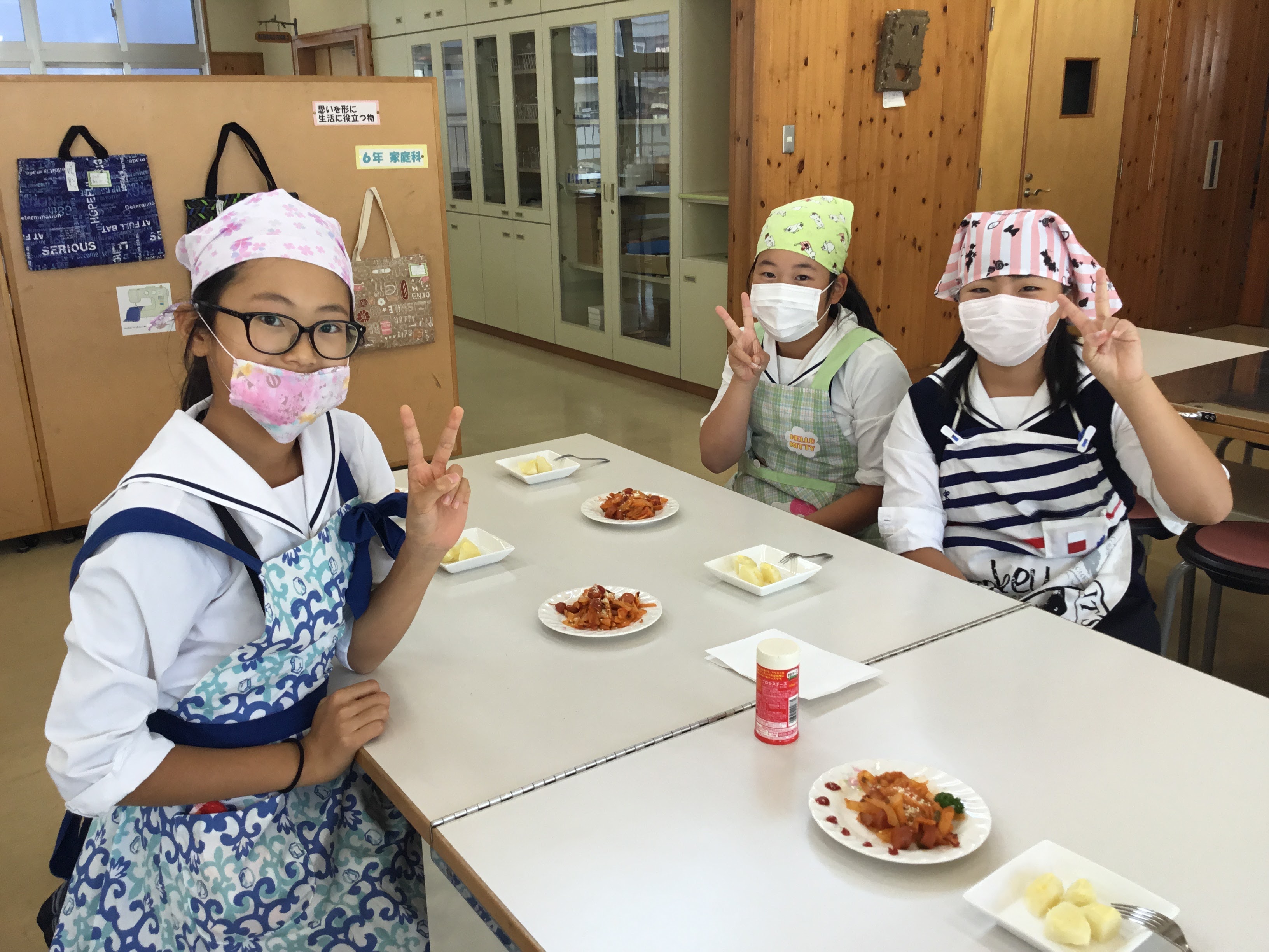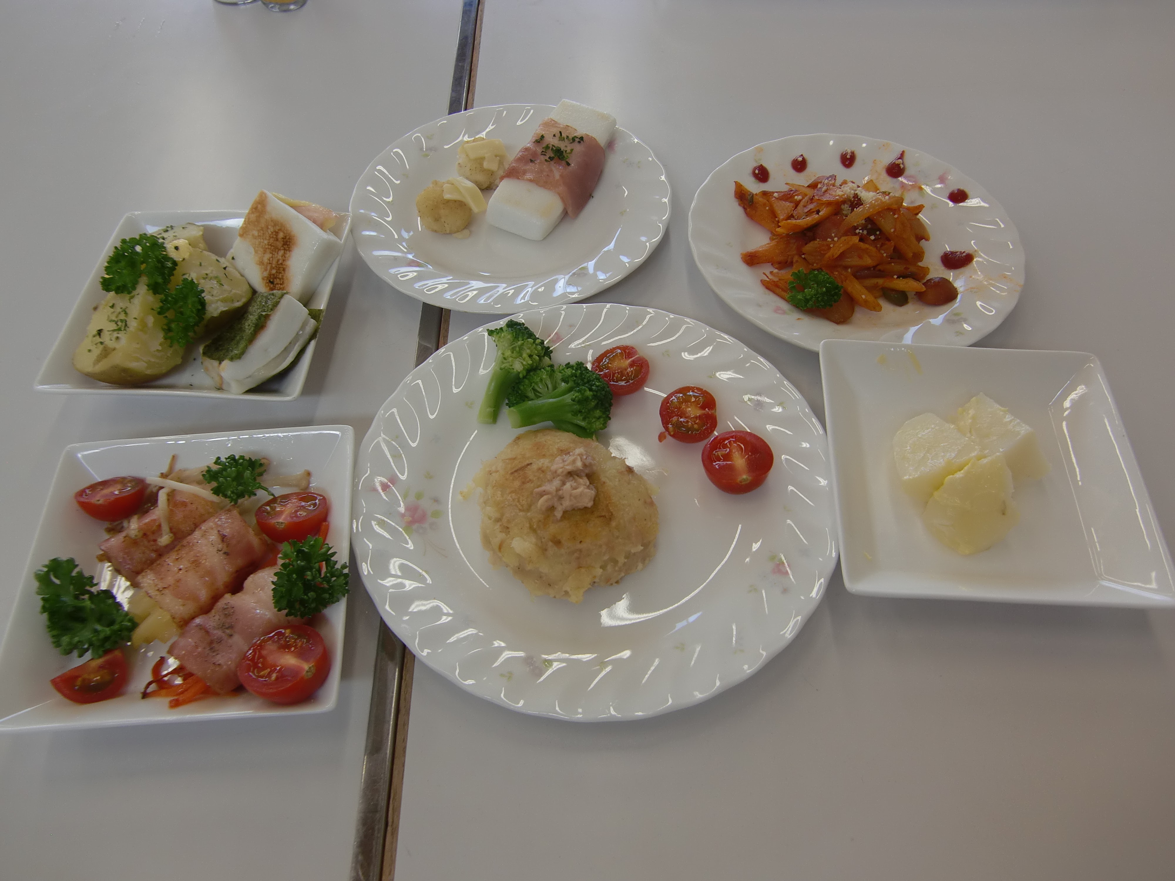 6年1組はマカロニナポリタンやベーコン野菜巻き、はんぺんじゃがバター、チーズ入りじゃがいも団子、ポテトハンバーグなどを作りました。
