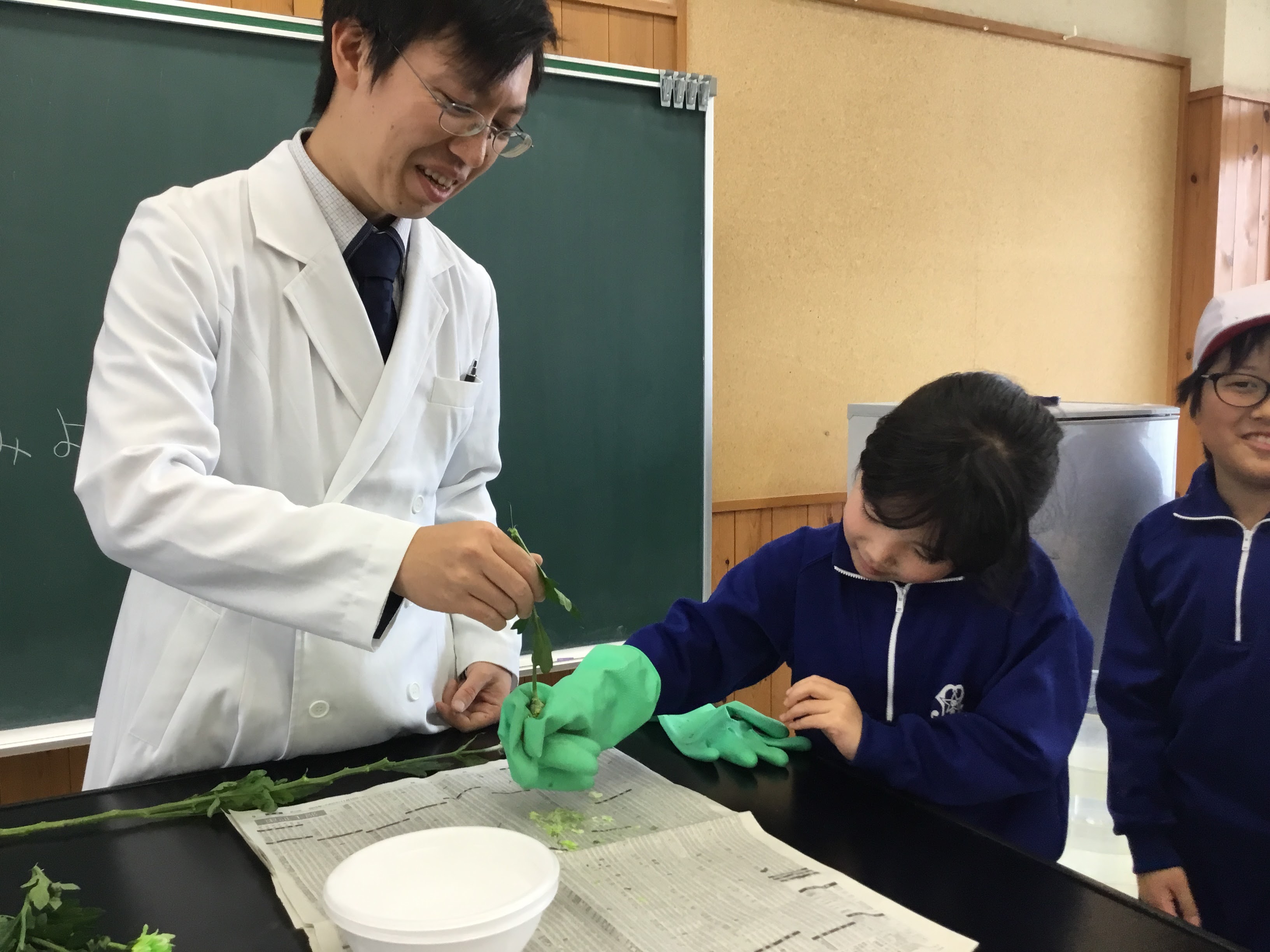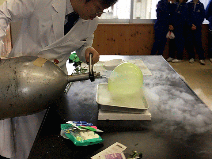 子どもたちは液体窒素につけた花が一瞬で凍る様子や、風船がしぼんでいく様子を見て