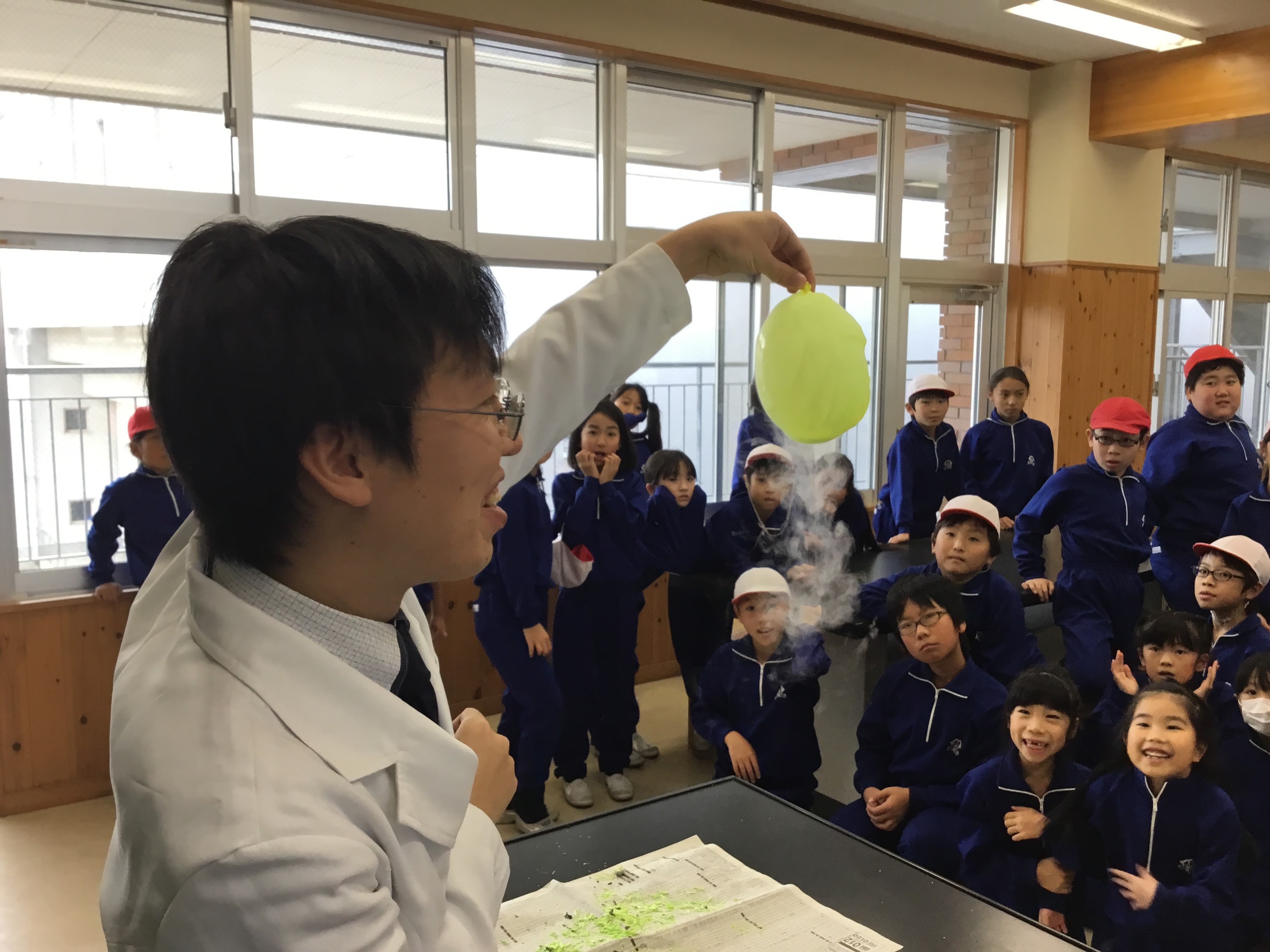 吉海先生は「液体窒素」を使って、-196度の世界を小学生にも分かりやすく実験をしてくださいました。