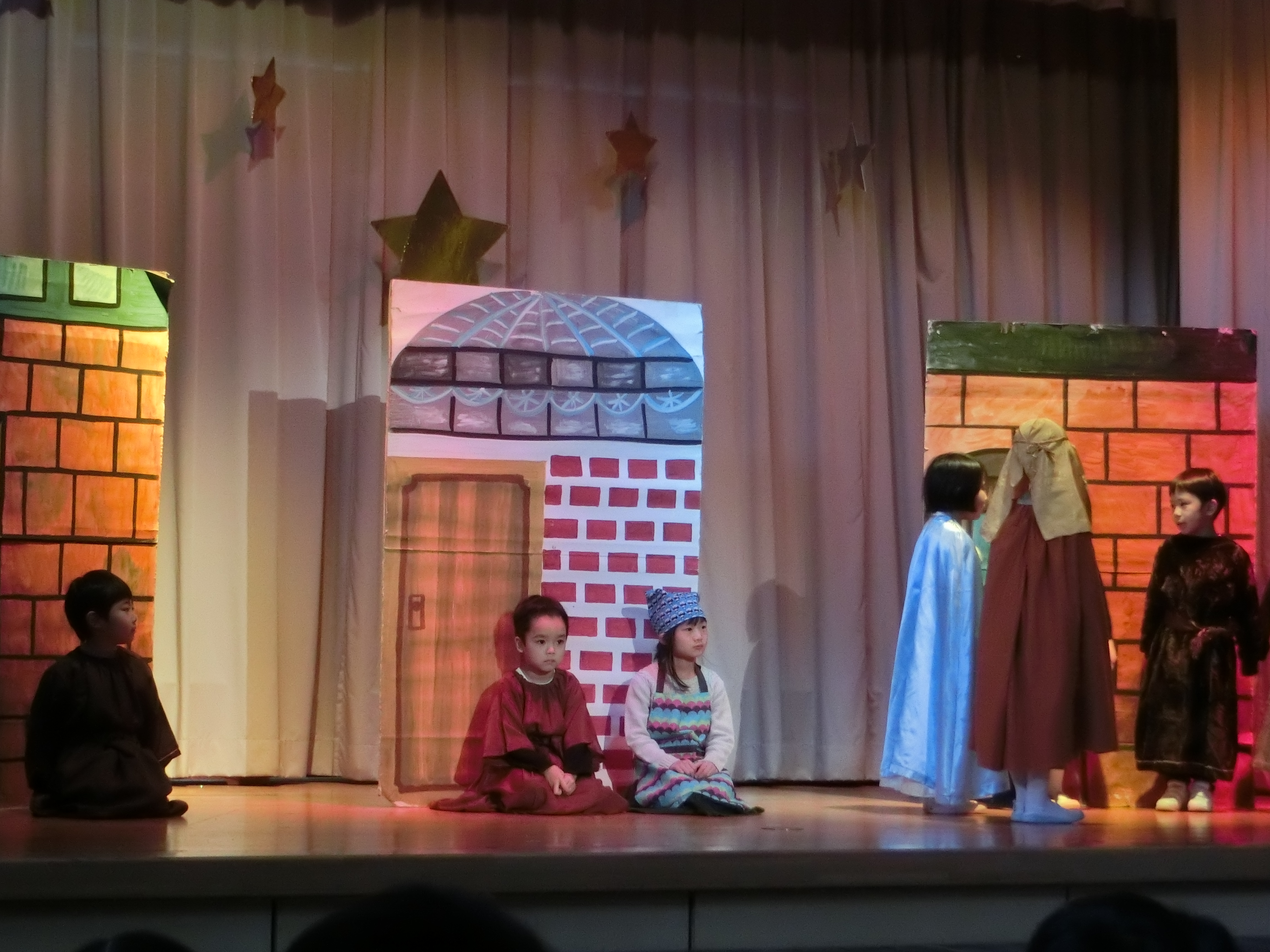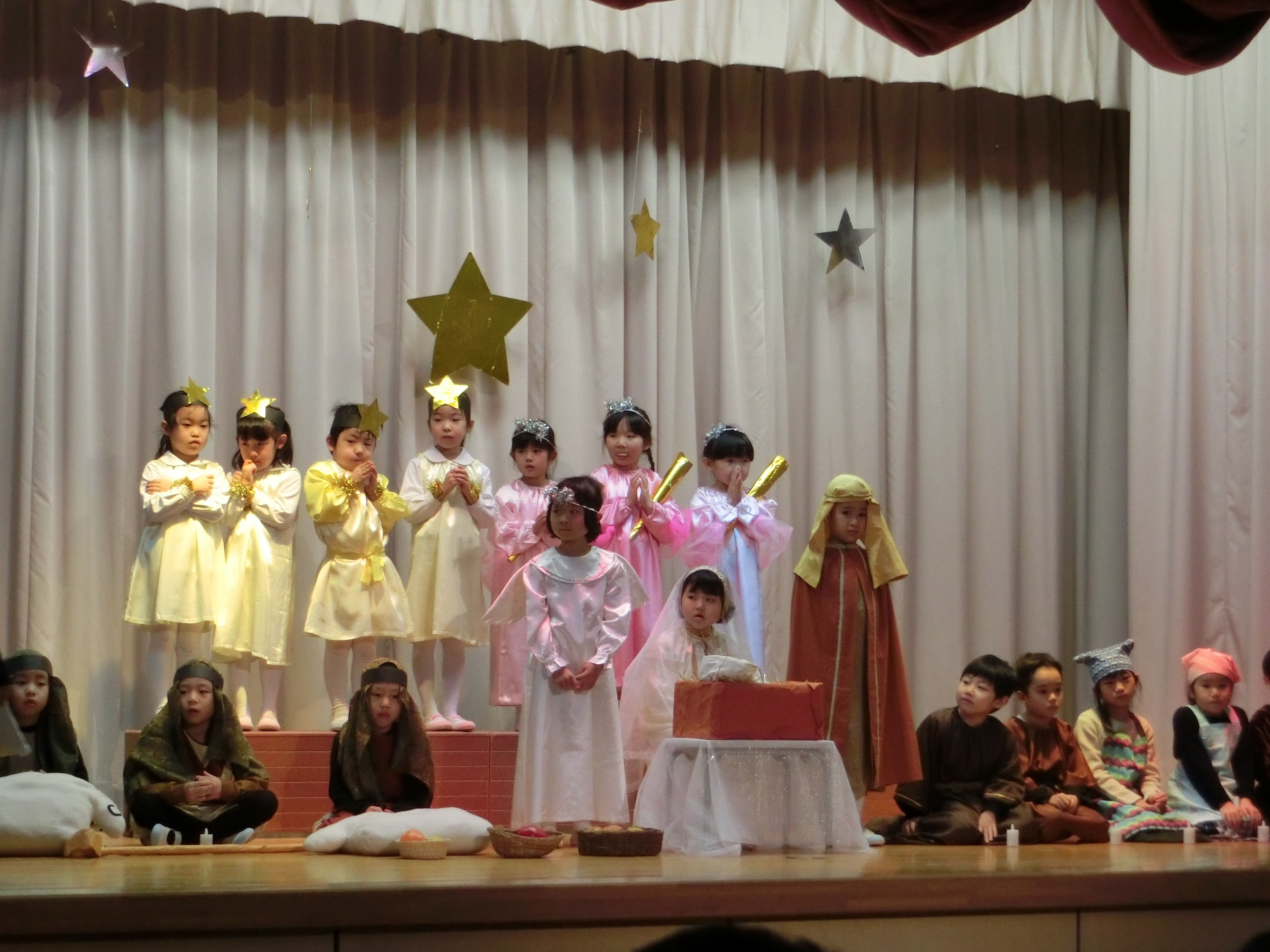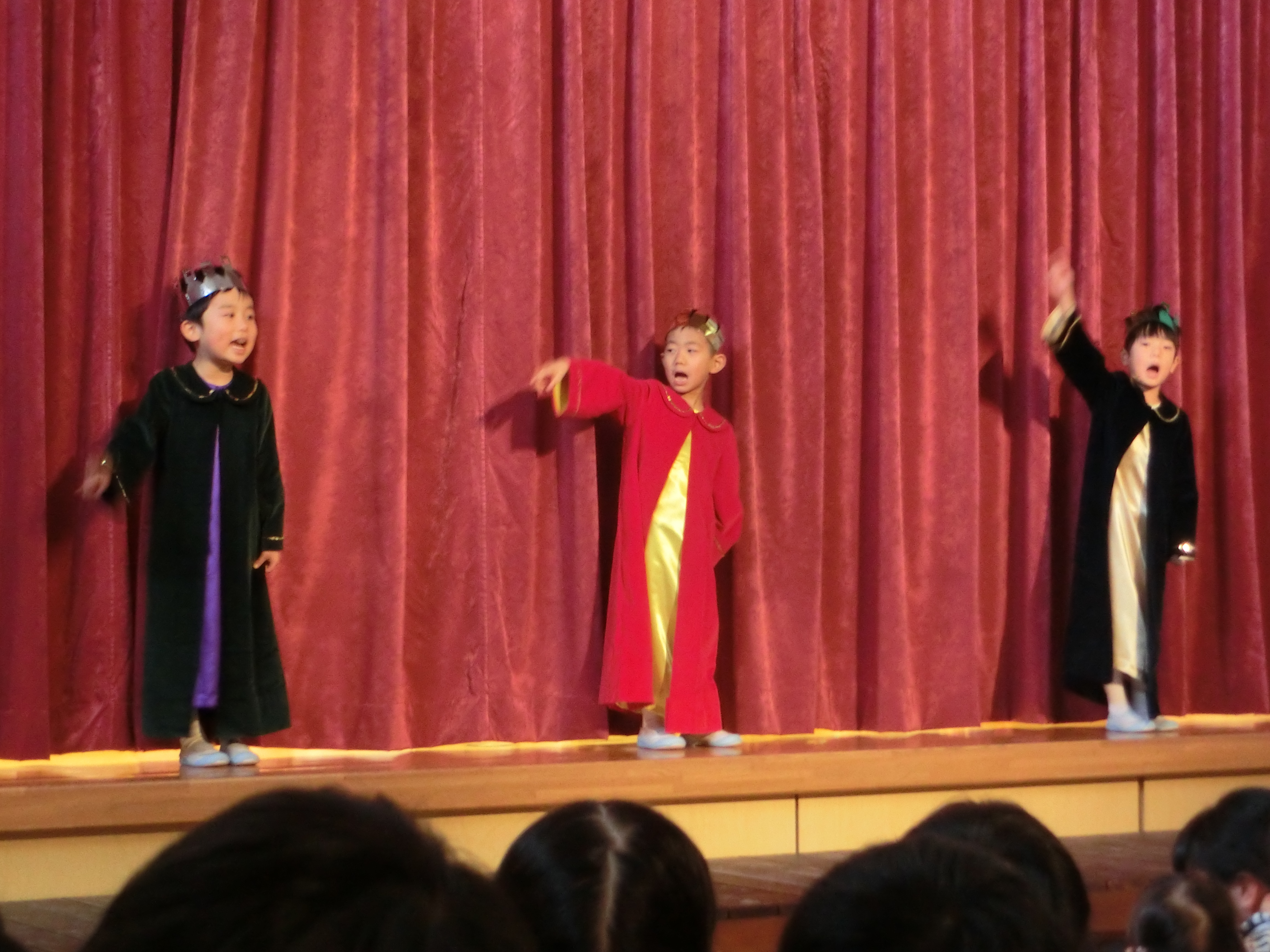 12月6日(木)に幼稚園のクリスマス会を小学校の1・2年生が見学してきました。見学したのは年長児「Christmas pageant」と聖劇「オペレッタ」「いちばんさいしょのクリスマス」(イエスさまのおたんじょう)キャンドルサービスです。