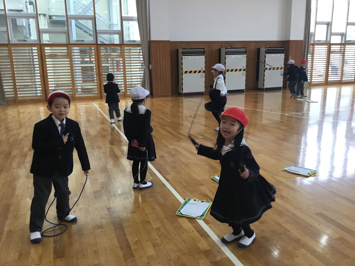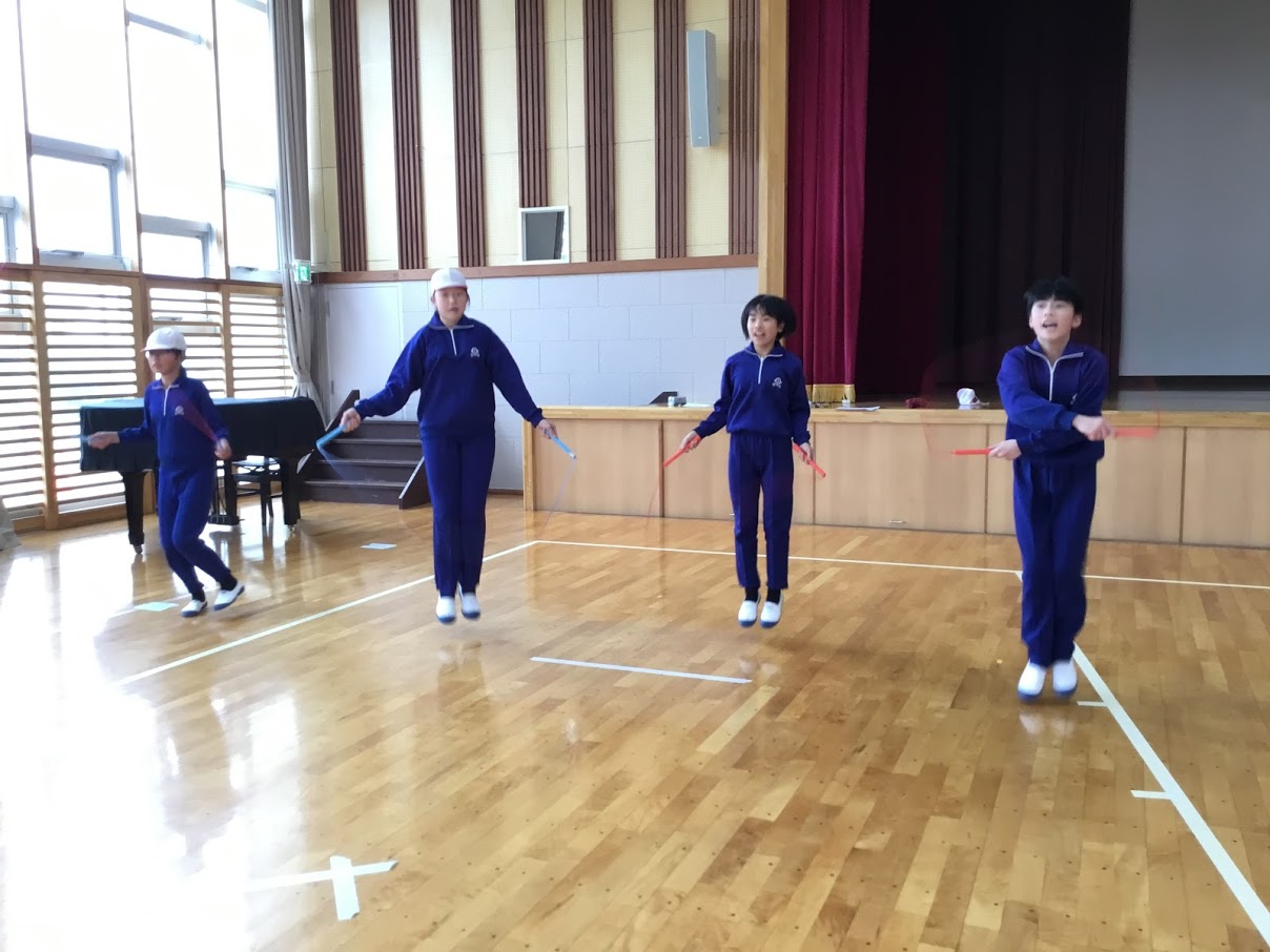 休み時間に講堂でなわとび行っています。