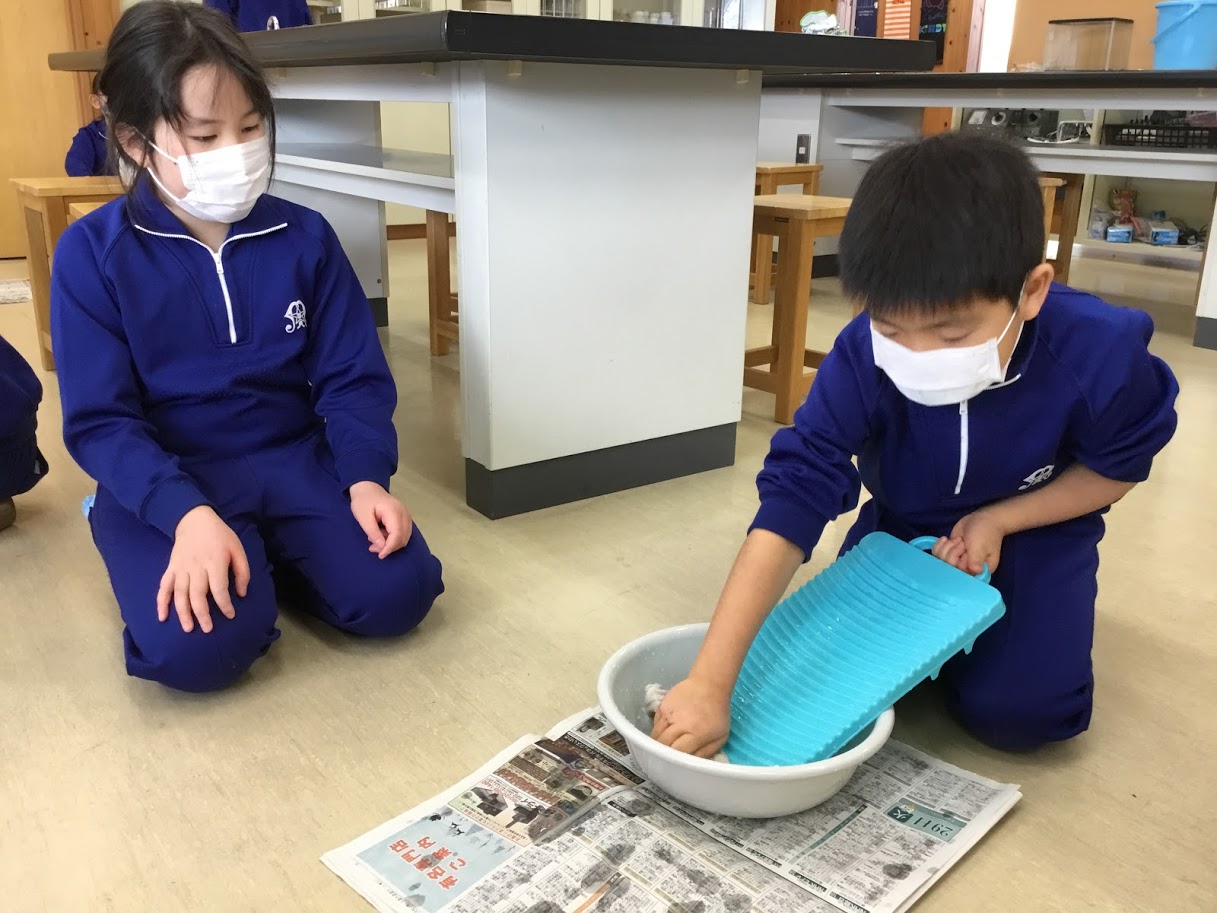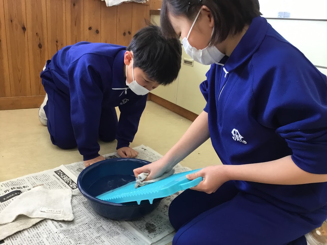 洗濯板を使ってぞうきんの洗濯をする活動をしました。