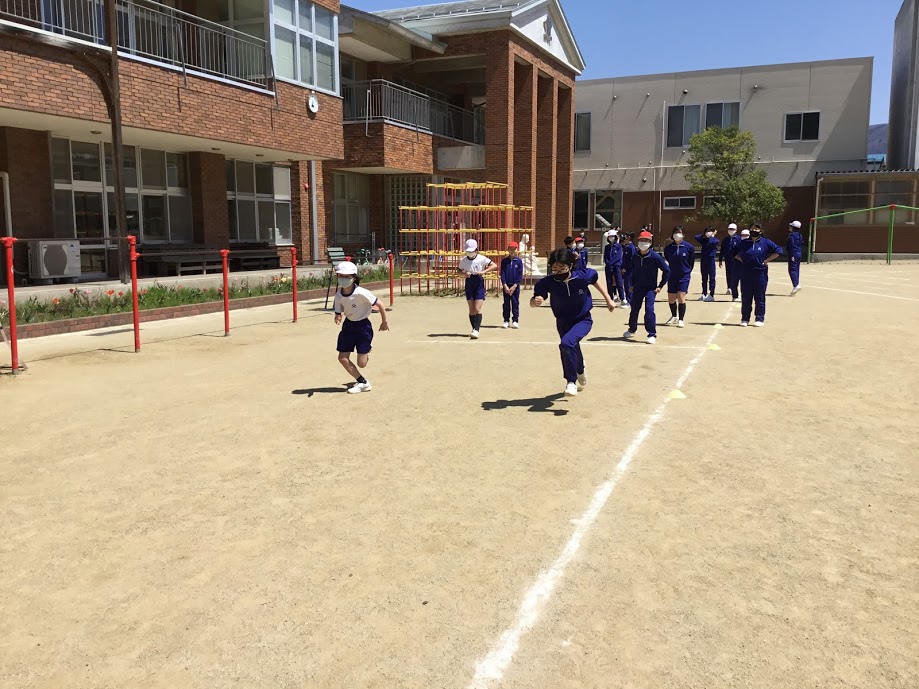1年生も小学校の広い校庭を元気いっぱい走っています。