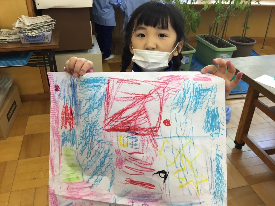 1年生は「クレヨンやパスとなかよし」という題材で、