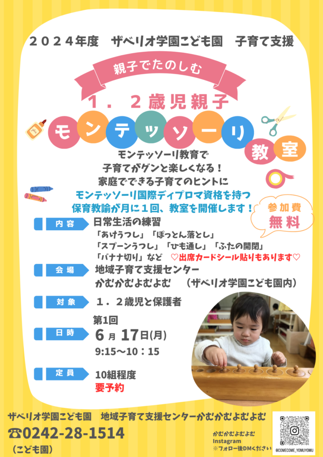6月 1、2歳児モンテッソーリ教室についてのお知らせ