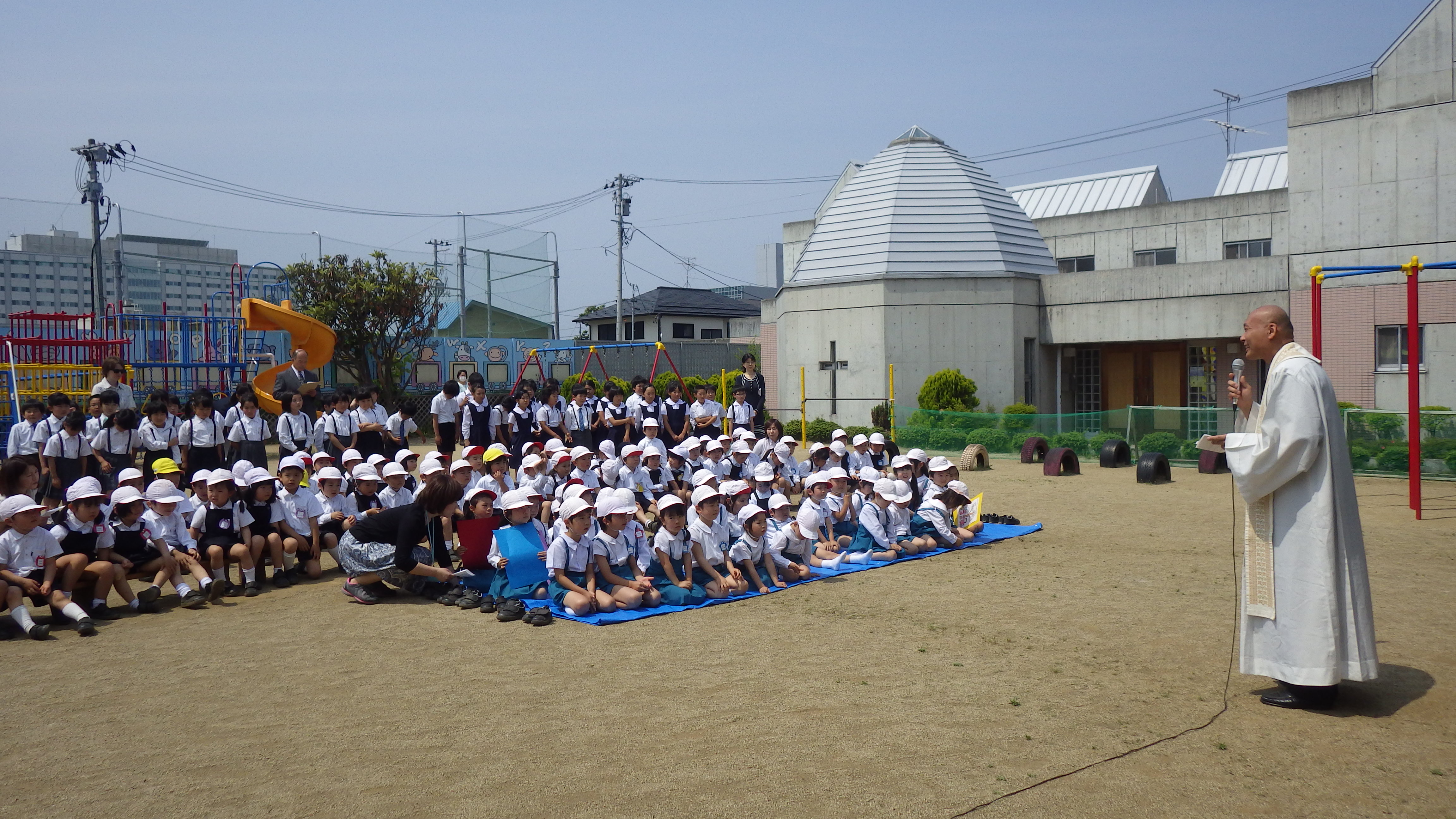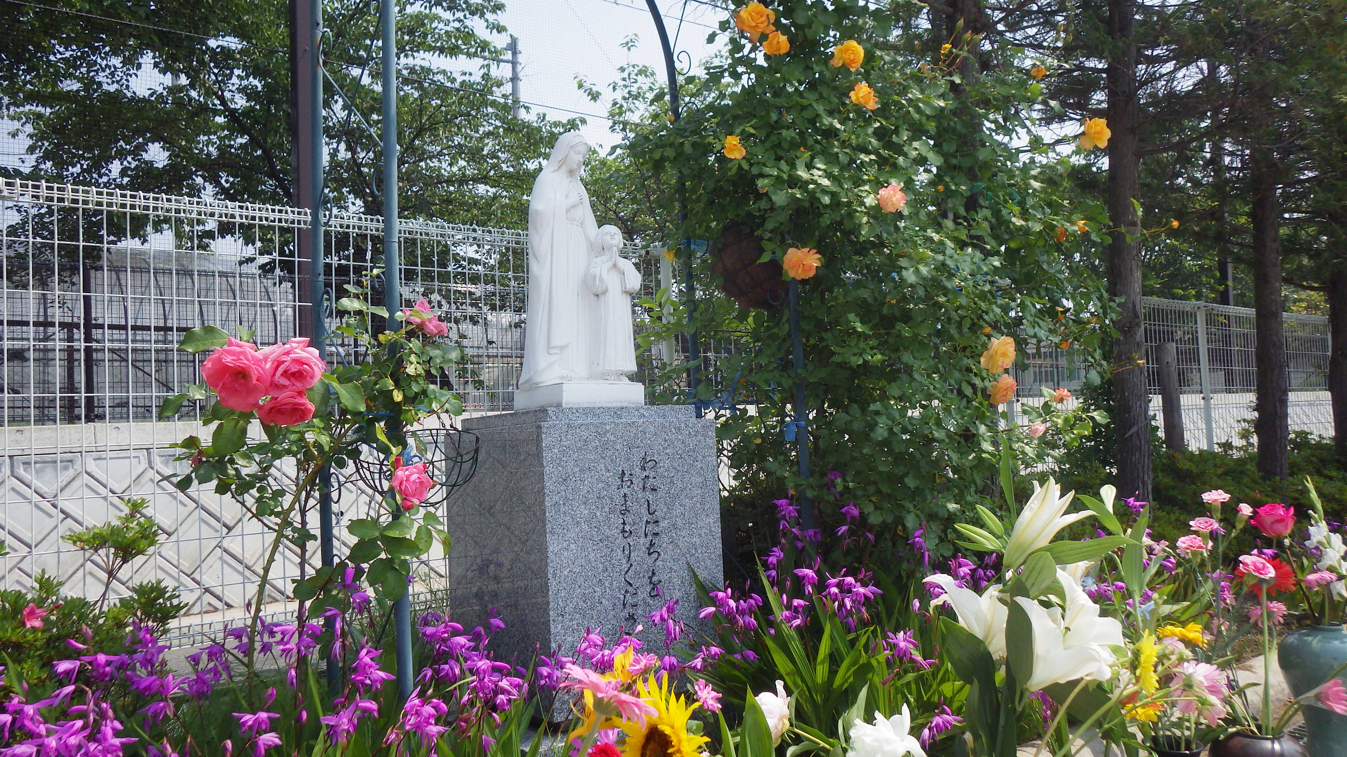 マリア様にお花を捧げ、神父様から大切なお話を聞きました。