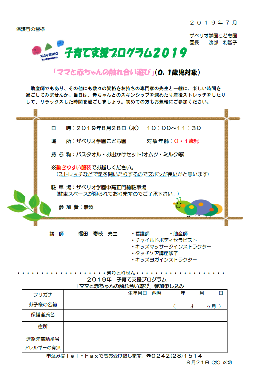 子育て支援のご案内「ママと赤ちゃんの触れ合い遊び」8月28日