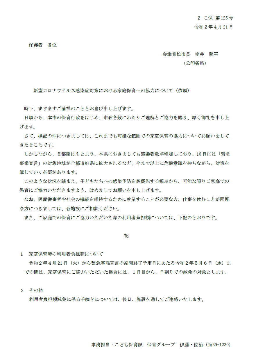 新型コロナウィルス感染症への対応に伴う家庭保育の協力依頼について