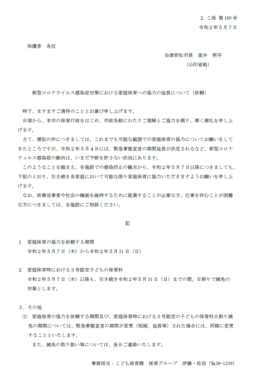 新型コロナウイルス感染症対策における家庭保育への協力の延長について(会津若松市からの依頼)
