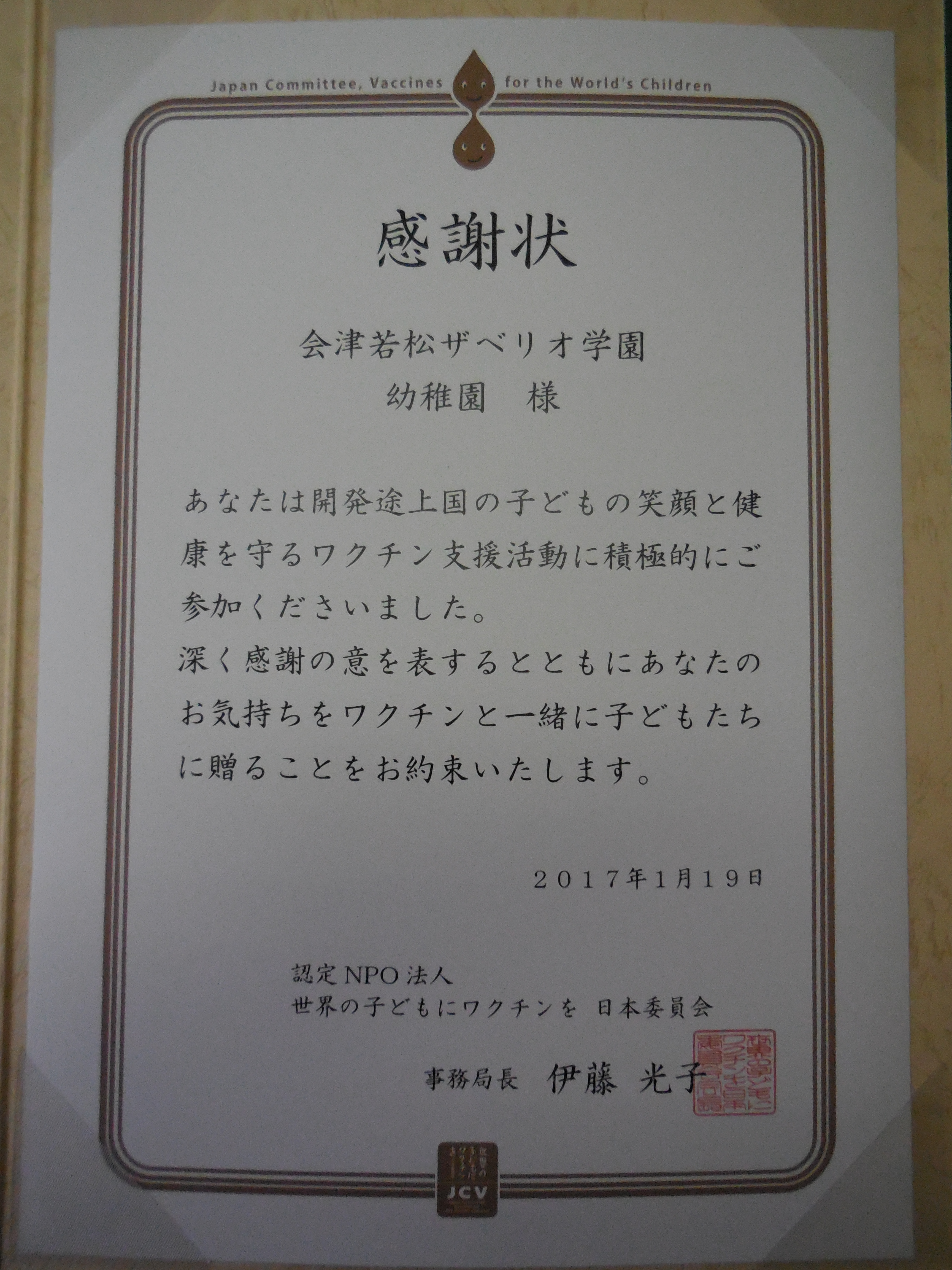 認定NPO法人 世界の子どもにワクチンを 日本委員会様より感謝状を頂きました。