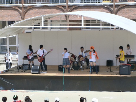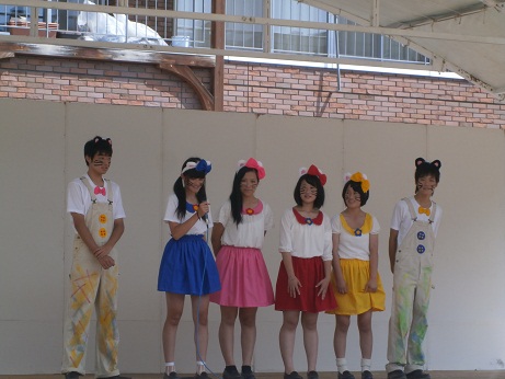 小学校校庭には特設ステージが設置され、部活動の発表や仮装・女装・男装の披露が行われました。高いパフォーマンスに対するどよめきや奇抜な衣装に対する笑いが起こってショーは大いに盛り上がり、観客は校舎のベランダにまでいっぱいになって催しを楽しんでいました。