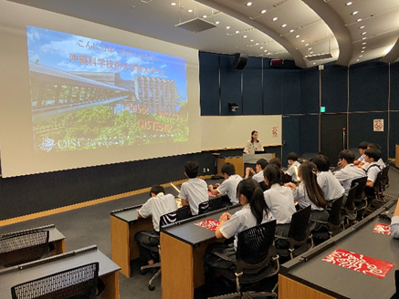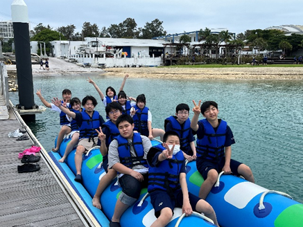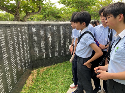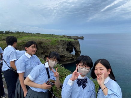 初日は平和祈念公園を中心とした平和学習をしました。2日目は、沖縄科学技術大学院大学訪問、やんばる自然塾でのカヌー体験、美ら海水族館を見学しました。3日目は、もとぶ元気村というマリンスポーツを体験できる施設を訪問。その後、班別研修へと出かけました。最終日は、万座毛と道の駅「かでな」を訪問し帰校しました。
