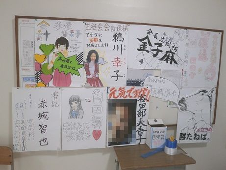 2日前には校舎のあちこちに候補者名やイラストの入ったポスターが貼られ、選挙戦がスタートしました。立候補者は、自分の名前を覚えてもらうべく工夫してアピールをしました。