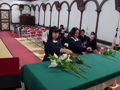 マリア様の聖歌を歌い、各自持ち寄ったお花をお献げして、