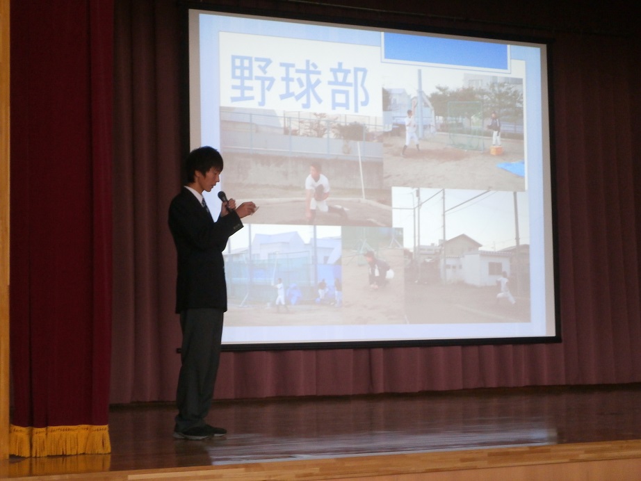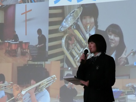 校長による挨拶ののち、在校生による学校紹介が行われました。自分の実体験を元にスライドを使ってわかりやすく説明しました。