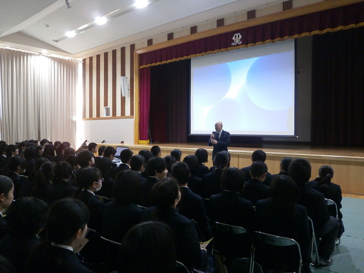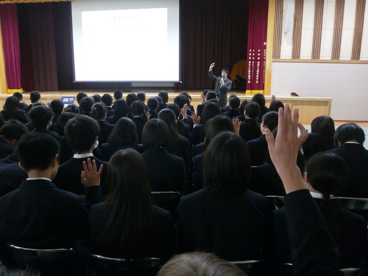 会津若松警察署の生活安全課から講師をお招きし、事故の実際や防犯などについてお話をうかがいました。その後、交通マナーに関するクイズに答えながら、安全に通学するための規則などを確認しました。
