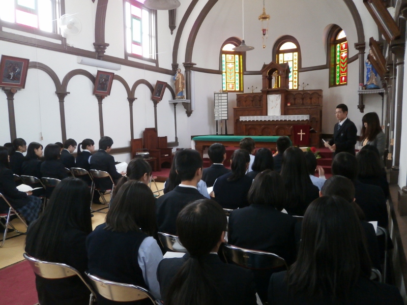 マリア祭では、生徒ひとり一人が持ち寄ったお花を活けて、お祈りとともにマリア様に捧げました。また、心を落ち着けて聖書の朗読や共同祈願を行い、感謝を示し自己をみつめるひとときを過ごしました。