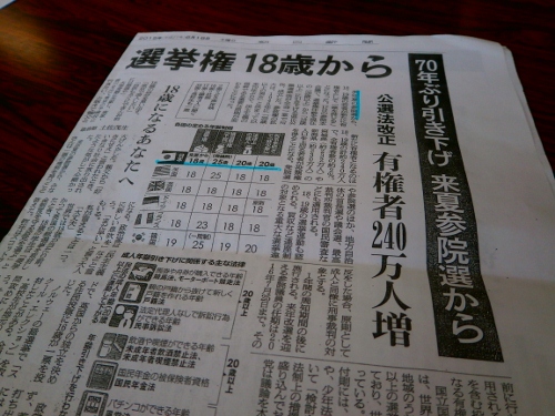夏から自主的に討議を重ねてきた新聞委員会を中心に、意識調査と模擬投票もあわせて行いました。上の写真は、7月3日に実施した、新聞委員を中心とした「18歳選挙について考える会」による勉強会の様子です。