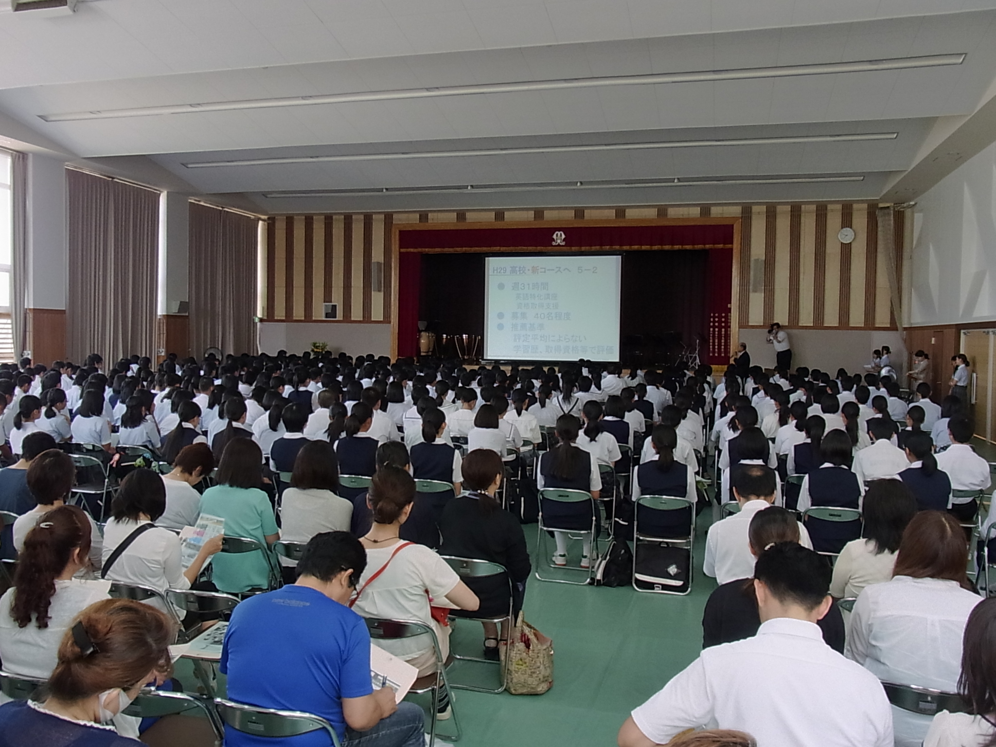 中学生と保護者の方約500名にご参加いただき、関校長から、来年度から設置される新コースの説明が行われました。