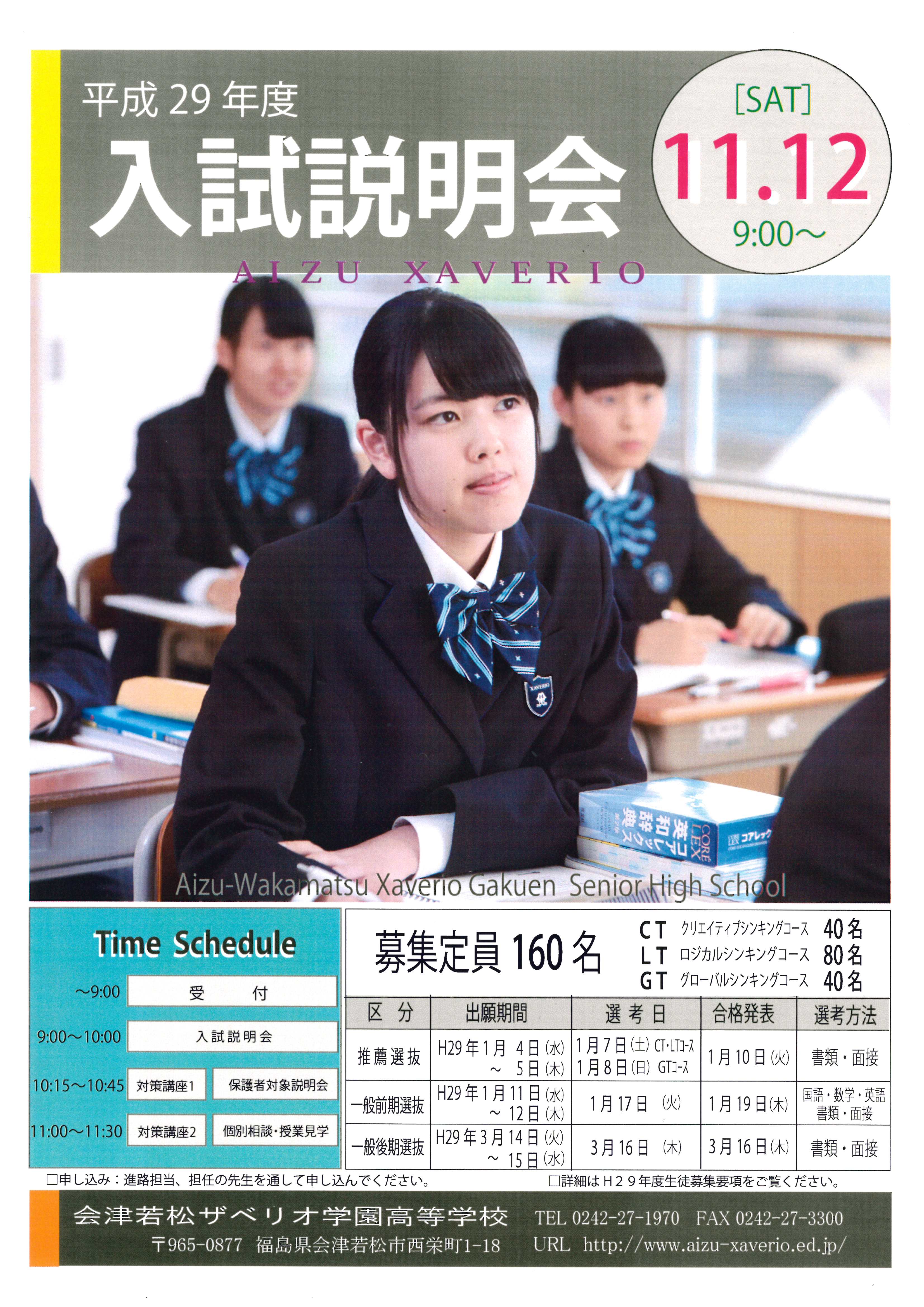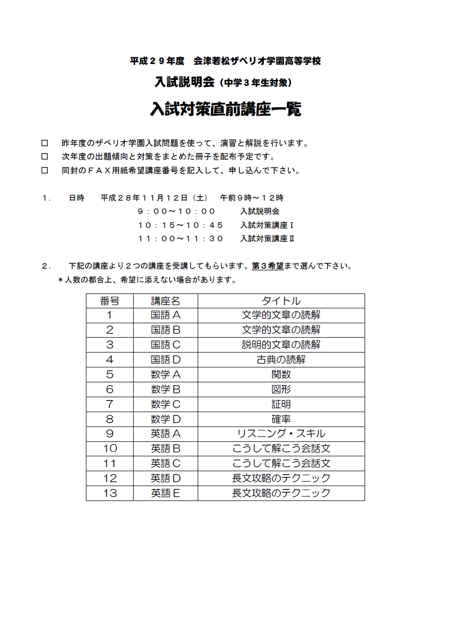 ・FAXの場合は、参加申込書をダウンロードし、参加者氏名及び体験授業講座の希望を入力した上で、0242-27-3300までお送りください。参加申込書をe-mail(school@aizu-xavier.fks.ed.jp)にて承ることもできます。