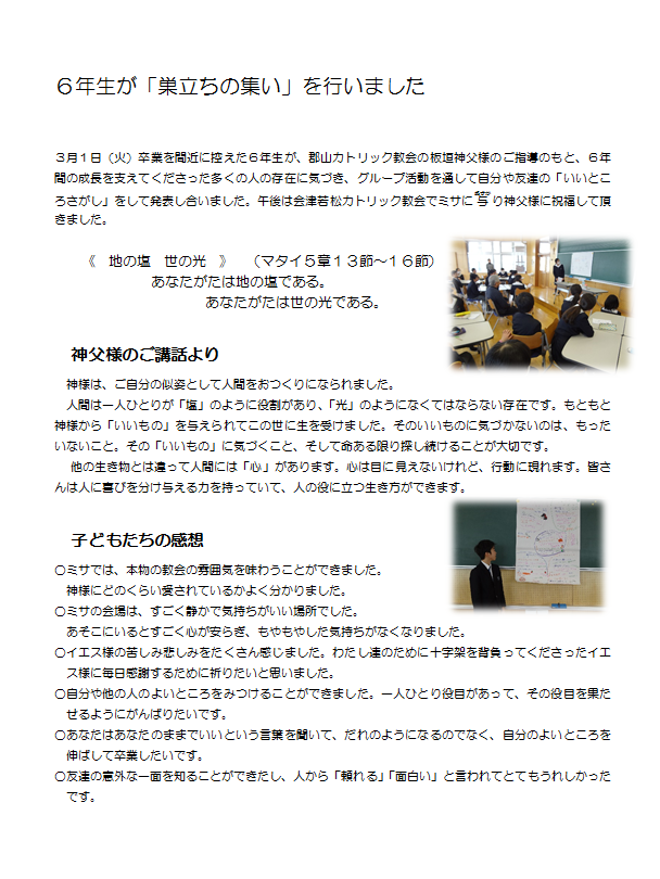 6年生が『巣立ちの集い』を行いました。