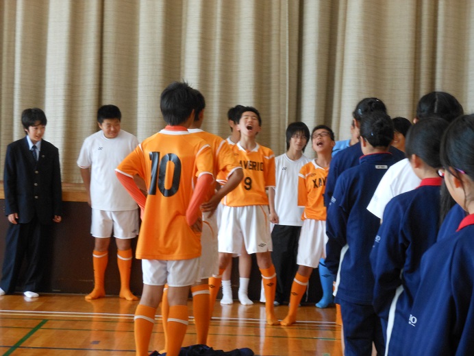 はじめに、鈴木教頭による激励メッセージがありました。この中で、試合に勝っている時は最後の1分1秒を気を抜かずにプレーをし、負けているときは逆に大きな声を出し、周りをみることが大切であり、気持ちを切り替えて視点を変えてみるという言葉をいただました。