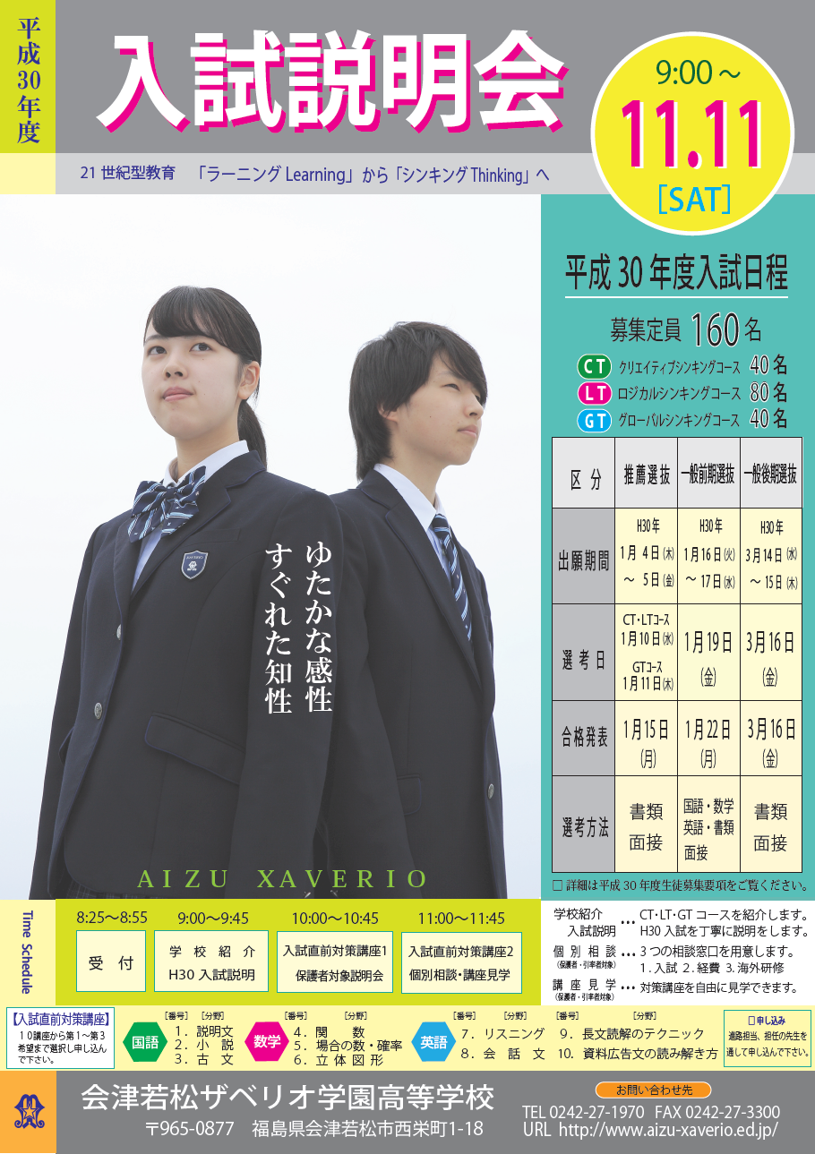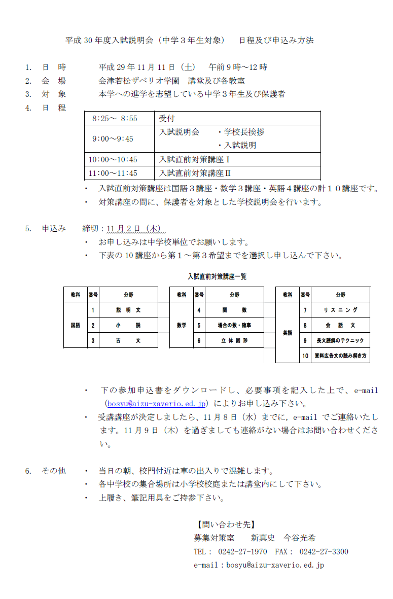 <参加のお申し込みについて> ・必ず、中学校を通じてお申し込みください。 ・参加申込書をダウンロードし、必要事項を記入した上で、e-mail(bosyu@aizu-xaverio.ed.jp)により11月2日(木)までにお申し込みください。