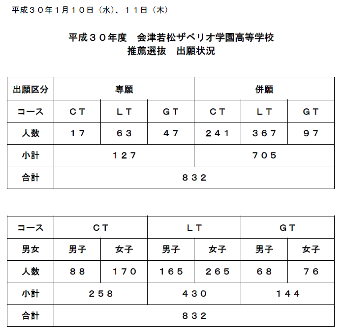 平成30年度 会津若松ザベリオ学園高等学校 推薦選抜試験 出願状況