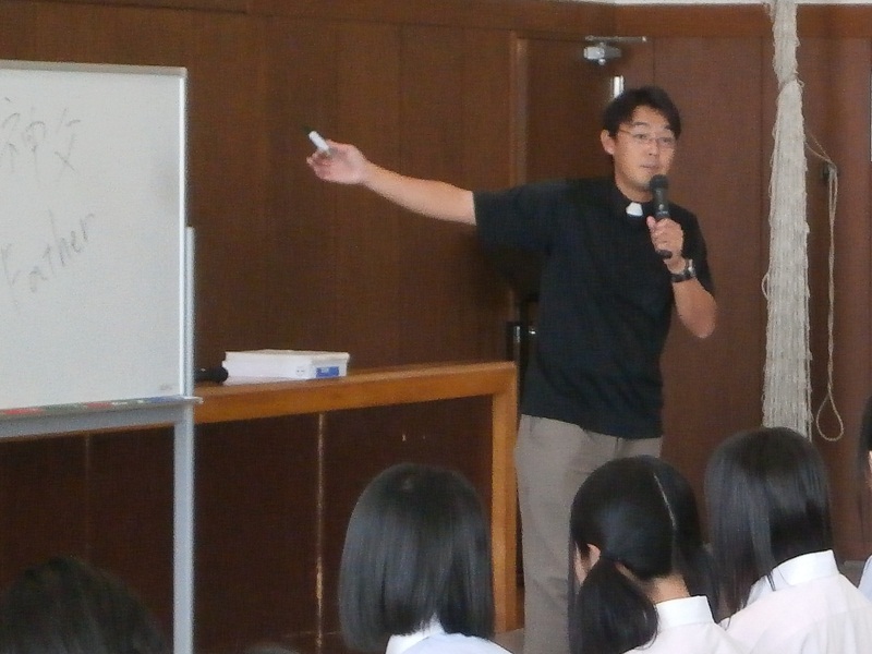 聖歌斉唱は通常はオルガン伴奏によりますが、関谷神父様は何とギターを用意して、全ての聖歌を弾き語りで歌ってくださいました。生徒たちも聖歌に興味がわいたようで、いつも以上に大きな歌声が講堂に響きました。