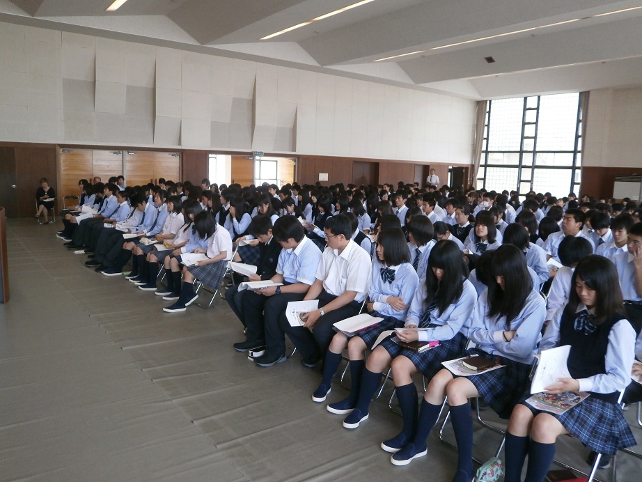 本校はカトリックミッションスクールで、キリスト教の理念に基づく心の教育のための行事を取り入れています。その中心的行事が心の集いです。6月6日、高校1年生を対象に心の集いが開催されましたので内容をお伝えします。
