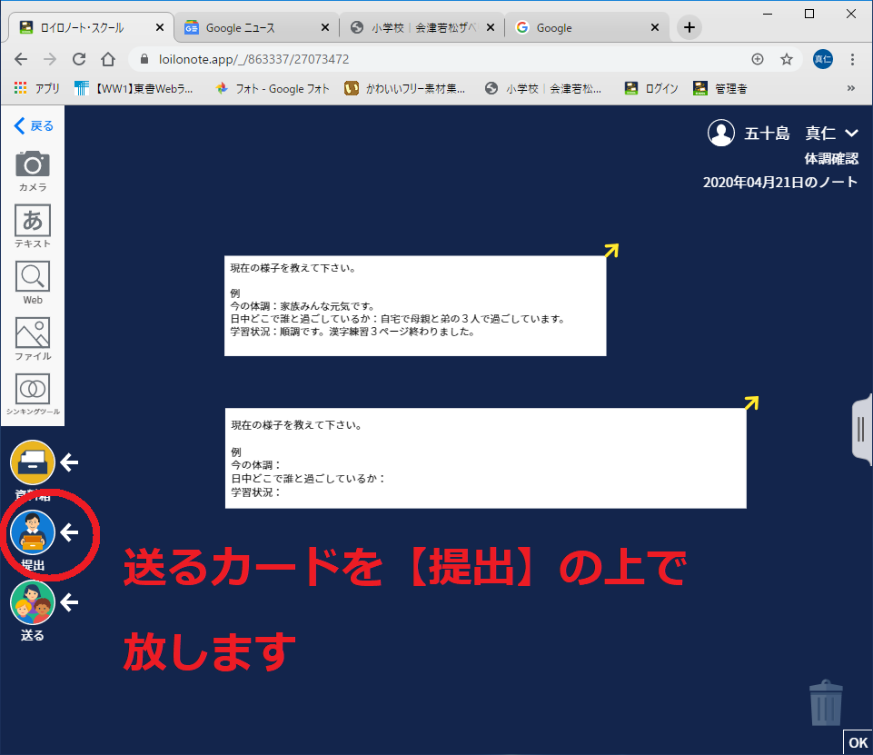 まず、4月22日(水)にロイロノートでカードを送ります。