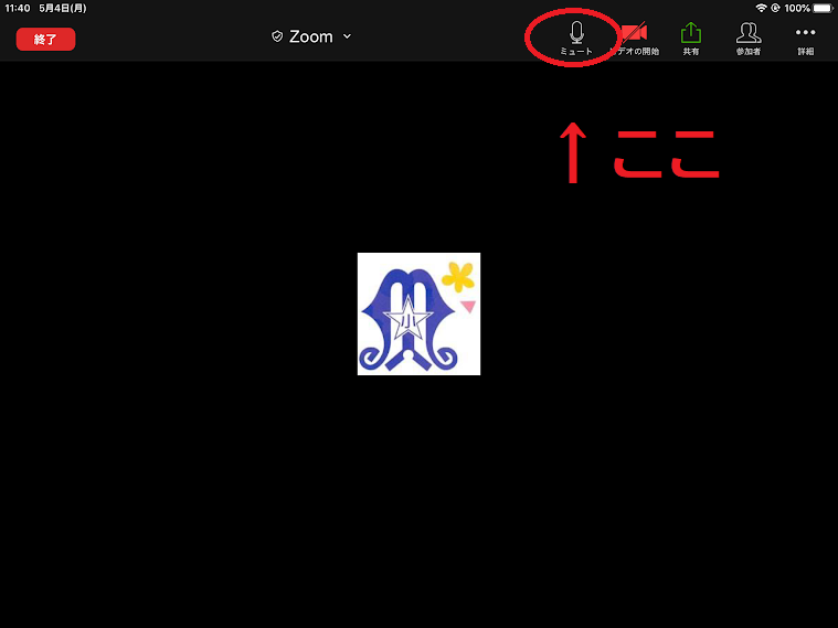 (2)ミュートの設定を確認をする。テストミーティング開始前は、主催者側で参加者のミュートをオンに設定しています。発言する場合は、それぞれミュートをオフにする必要がありますので、ミュートをオフにする方法(場所)を確認してください。