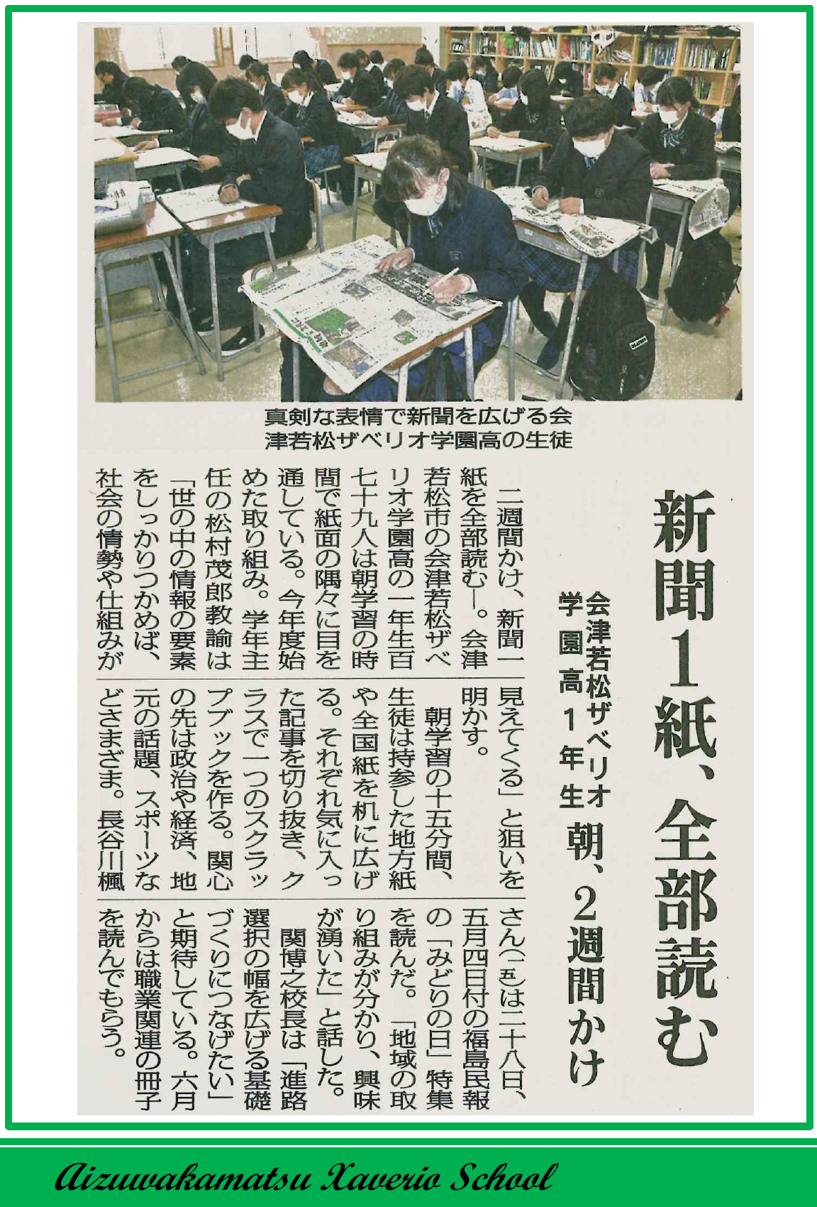 本校の新聞を用いた朝学習の取り組みが、福島民報新聞に掲載されました!